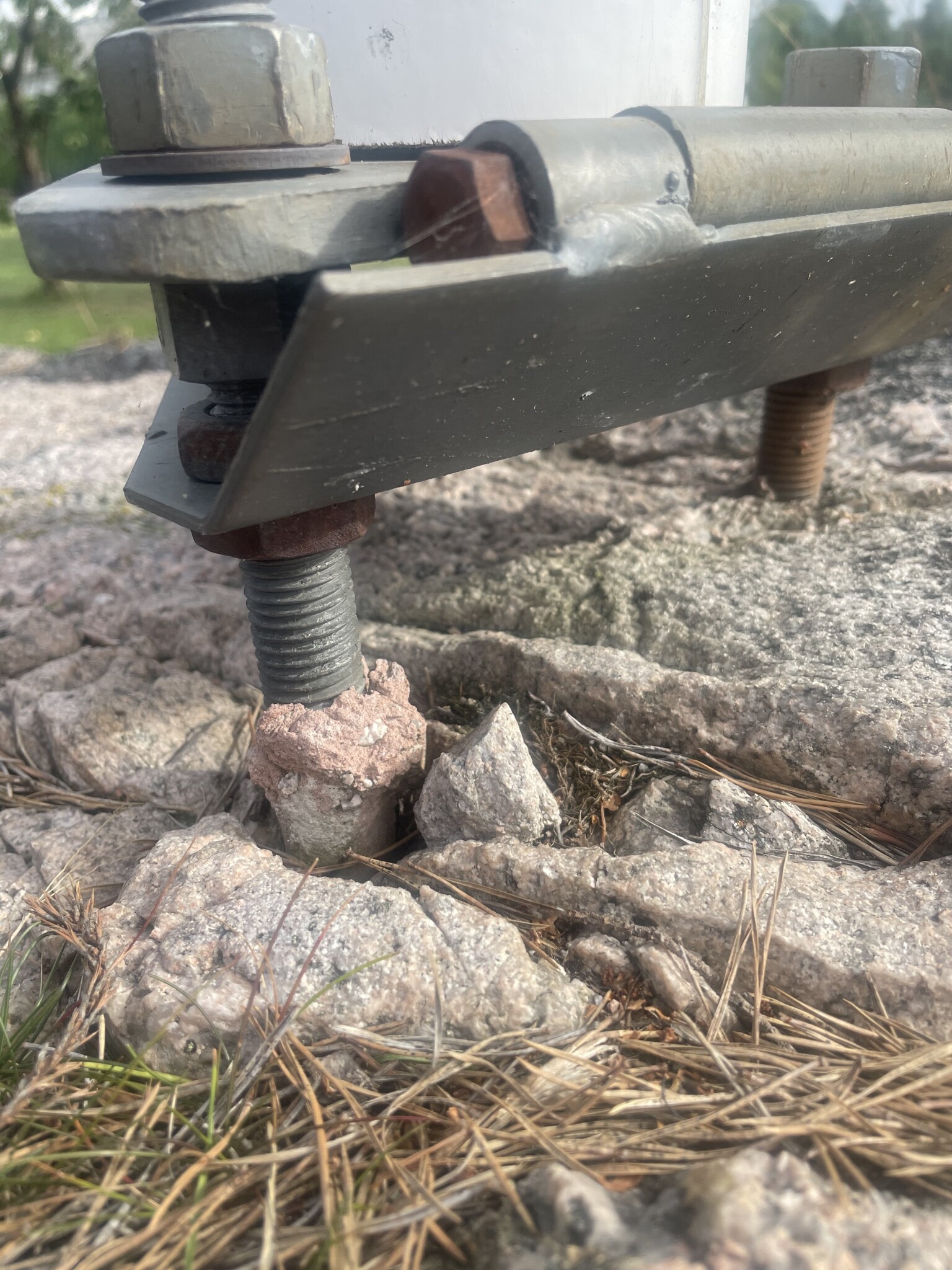 Vår flaggstång är förankrad i berg. Tre hål är borrade och fästbultar nedslagna.