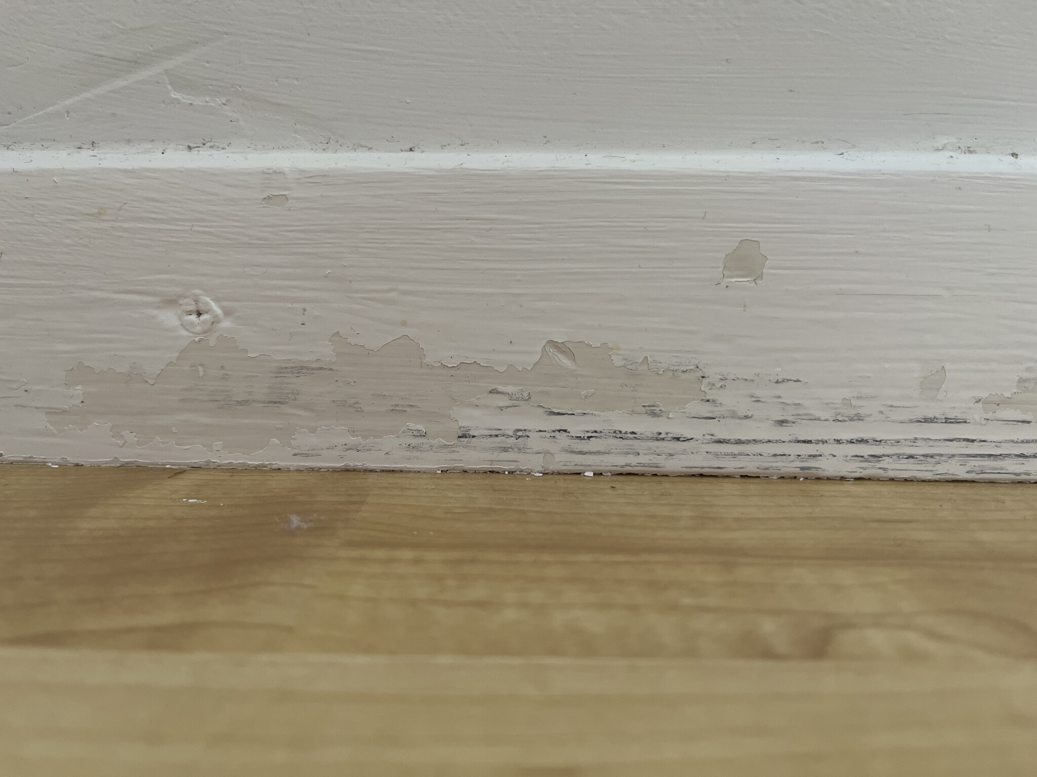 Flagnad färg golvlister (och snickerier dörrkarm) (ommålade höst 2023)