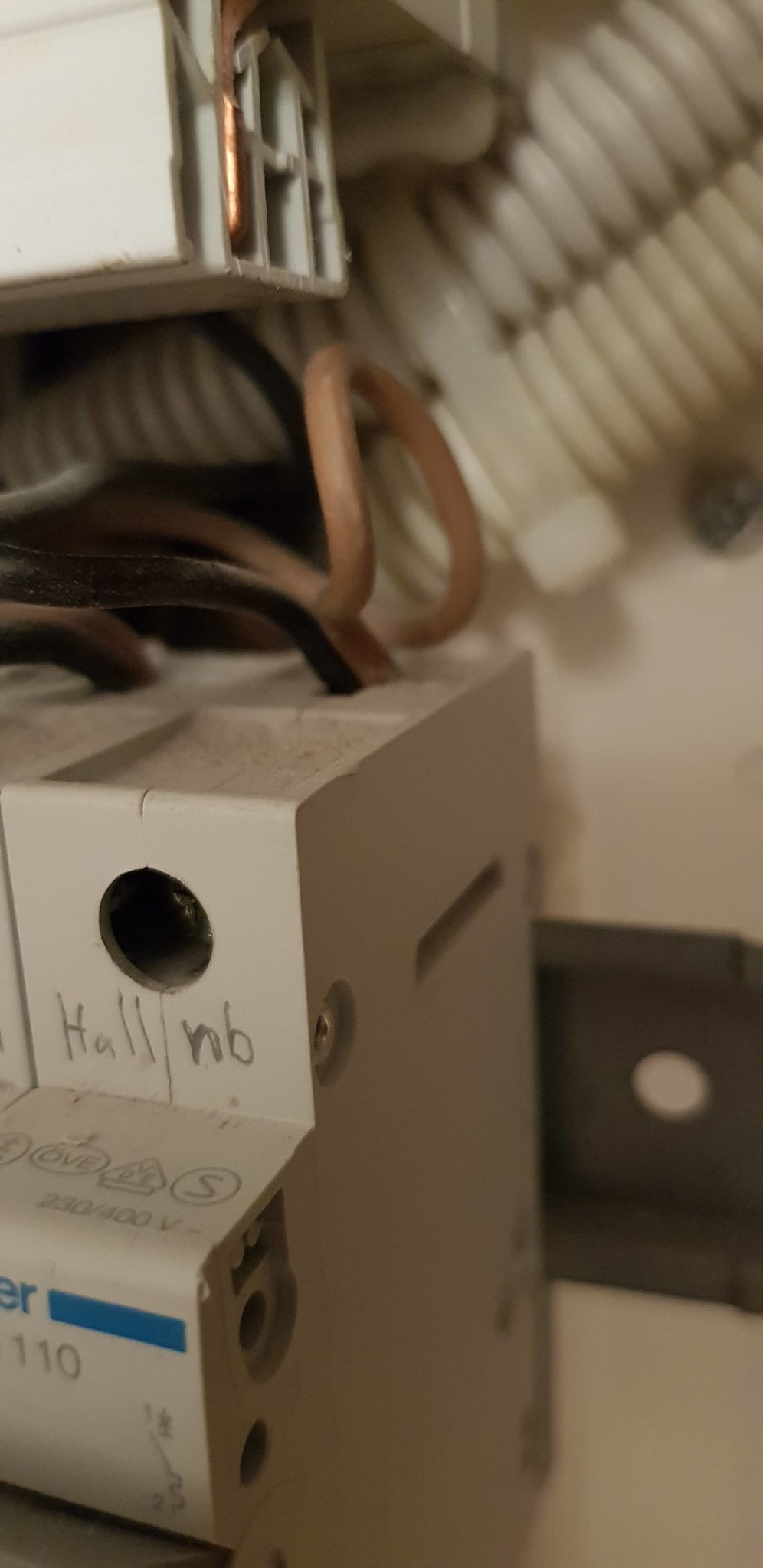 Det är NEJ NEJ NEJ - det skall sitta ett isolerskydd över änden! (Där har Du 400V mellan skenor, och huvudsäkringen bakom, förhoppningsvis dock via jordfelsbrytare)