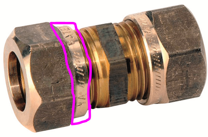 Då är änden av det röret en del av en konisk tätning. Detsitter en ring på kopparröret med konisk kant/yta. Den är avsedd att passa mot den koniska insidan av röret. Och ringen kommer att tryckas ihop och krama röret när man drar ihop kopplingen.