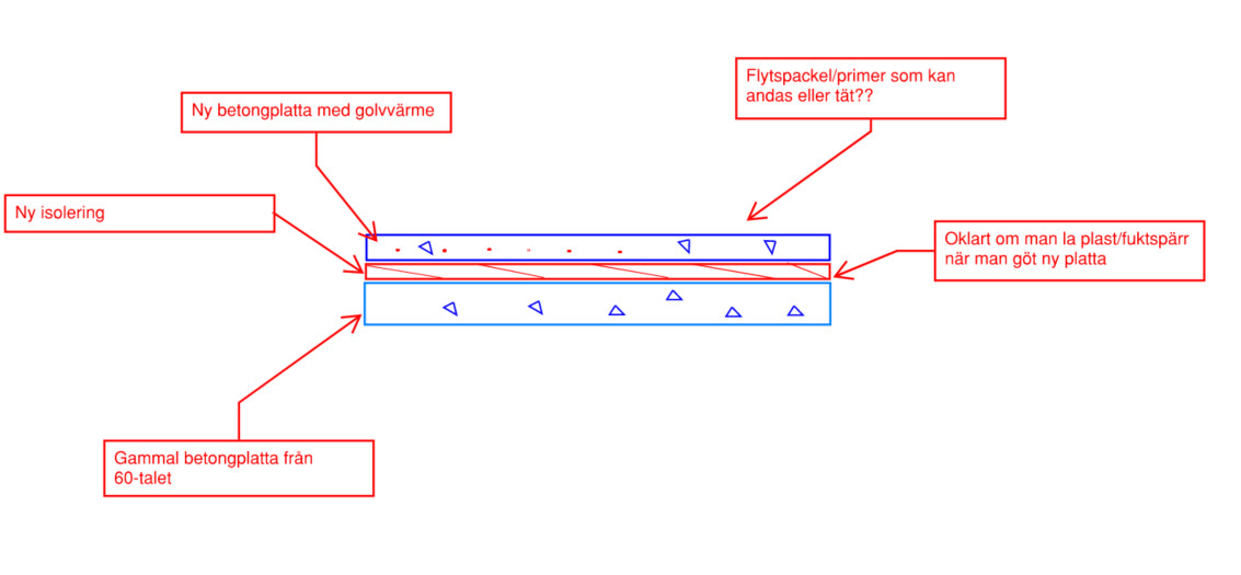 Där jag ska göra tvättstuga/groventre är idag endast den nya betongplattan som golv. Väggar och tak är färdigt. Bör jag välja flytspackel/primer som andas eller spelar det ingen roll? Jag vet inte om man la en plast på den Befintliga plattan som fuktspärr innan man la på isolering och ny betong, om det har betydelse?