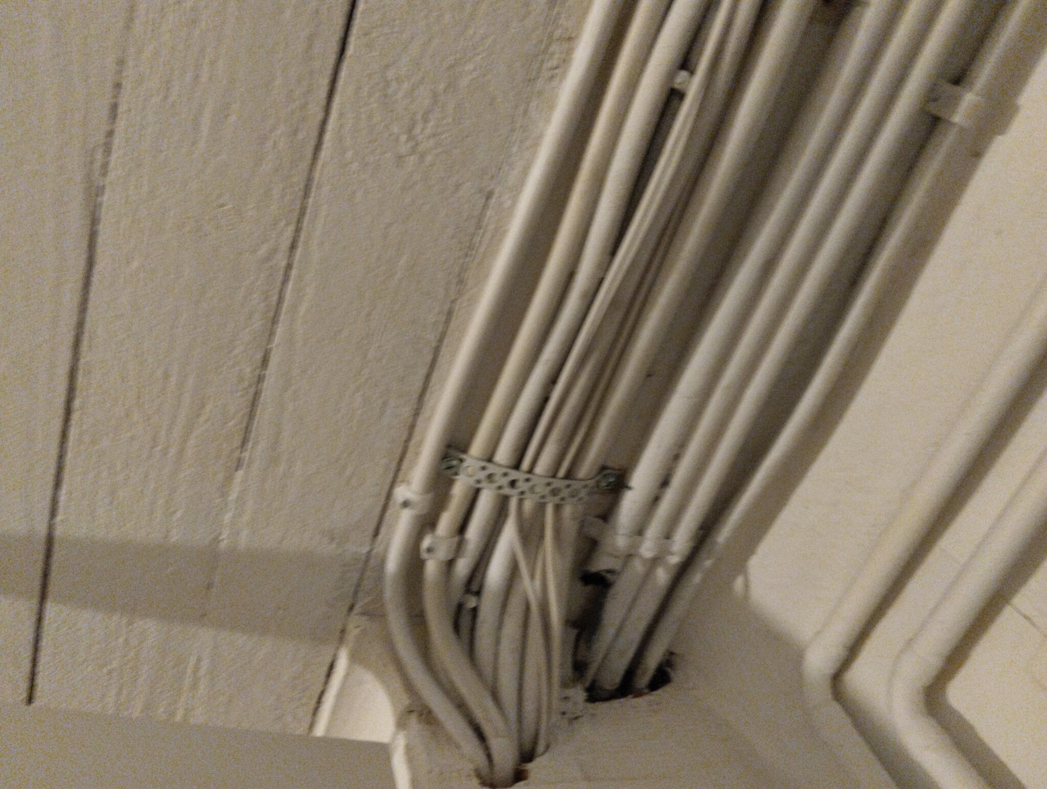 - Nästan all el från centralen går utanpåliggande i taket till resten av huset.