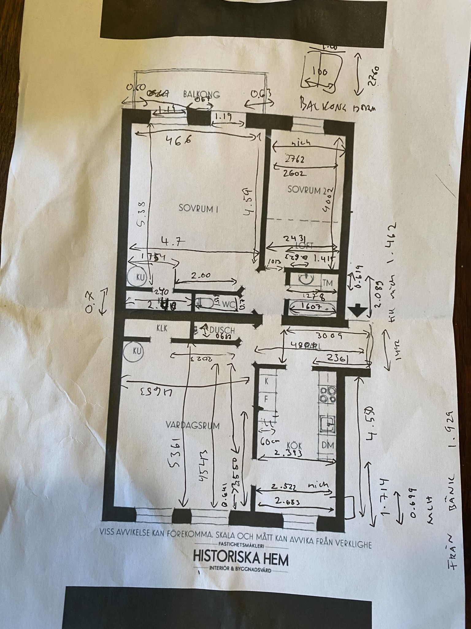 För att få ett extra rum skall vi flytta köket i vår nya lägenhet från nuvarande plats till rummet med balkongen. Vi kommer att göra detta i samband med föreningens stambyte. Vi skulle helst vilja ha köket mot den långa väggen med kakelugnen men är osäkra på om det är möjligt och hur kostsamt det i så fall skulle bli. Någon som har erfarenhet? Bifogar planritning med mått. Gick fort på visningen men hoppas ni kan få en överblick.
