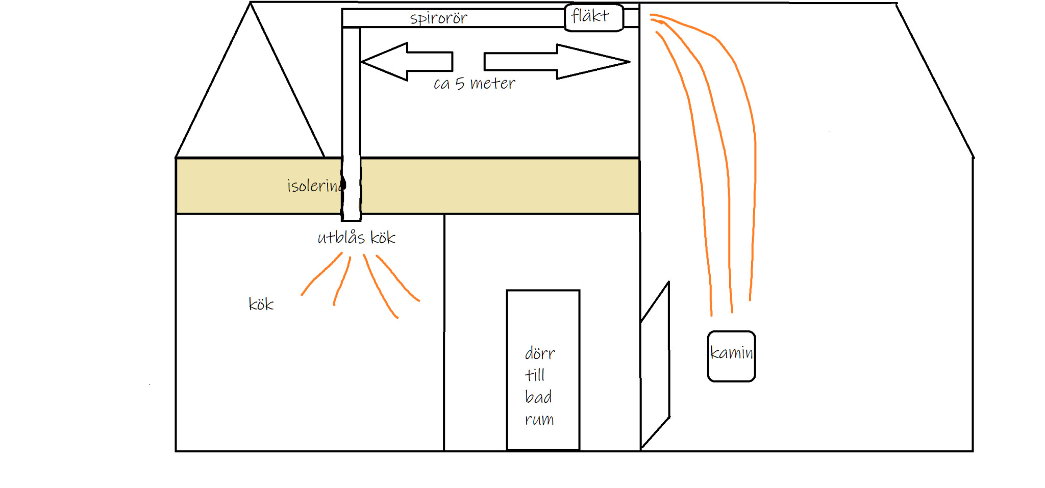 Hej! I vardagsrummet har vi ett rum som är öppet upp till nock. I samma rum finns en insatsspis som ger väldigt bra med värme. Iom att vi har öppet upp till nock tänkte jag att det måste vara väldigt lätt att installera lite ventrör för att förflytta den groteskt varma luften vid nock till ett ställe som vi har svårt att värma upp, köket.