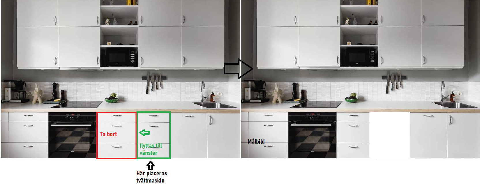 Tjena, ska sätta in en tvättmaskin i köket och behöver därför ta bort ett köksskåp för att få loss plats, men även önskvärt att "möblera" om skåpen så vi får som vi vill ha det.