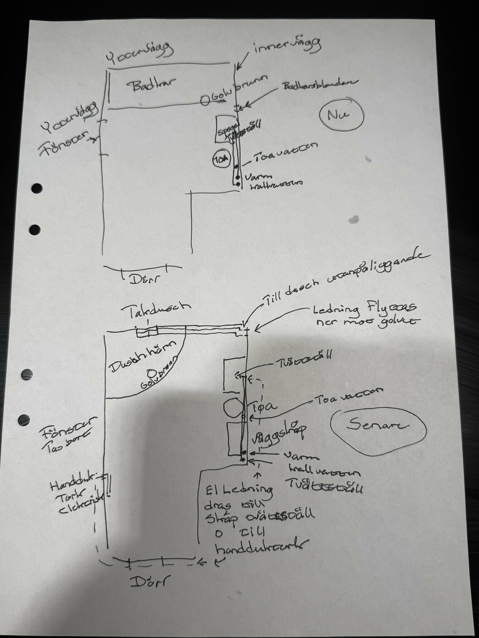 Ska i princip riva nästan allt för enkelheten så det blir enklare dra el, VVS mm. Golvbrunn ska också flyttas. Och framförallt bytas…är en gjutjärn idag. Och har nyss haft vattenskada o haft ut bergvärme o tvättstugan. Skissen är inte den bästa..jag vet 😂