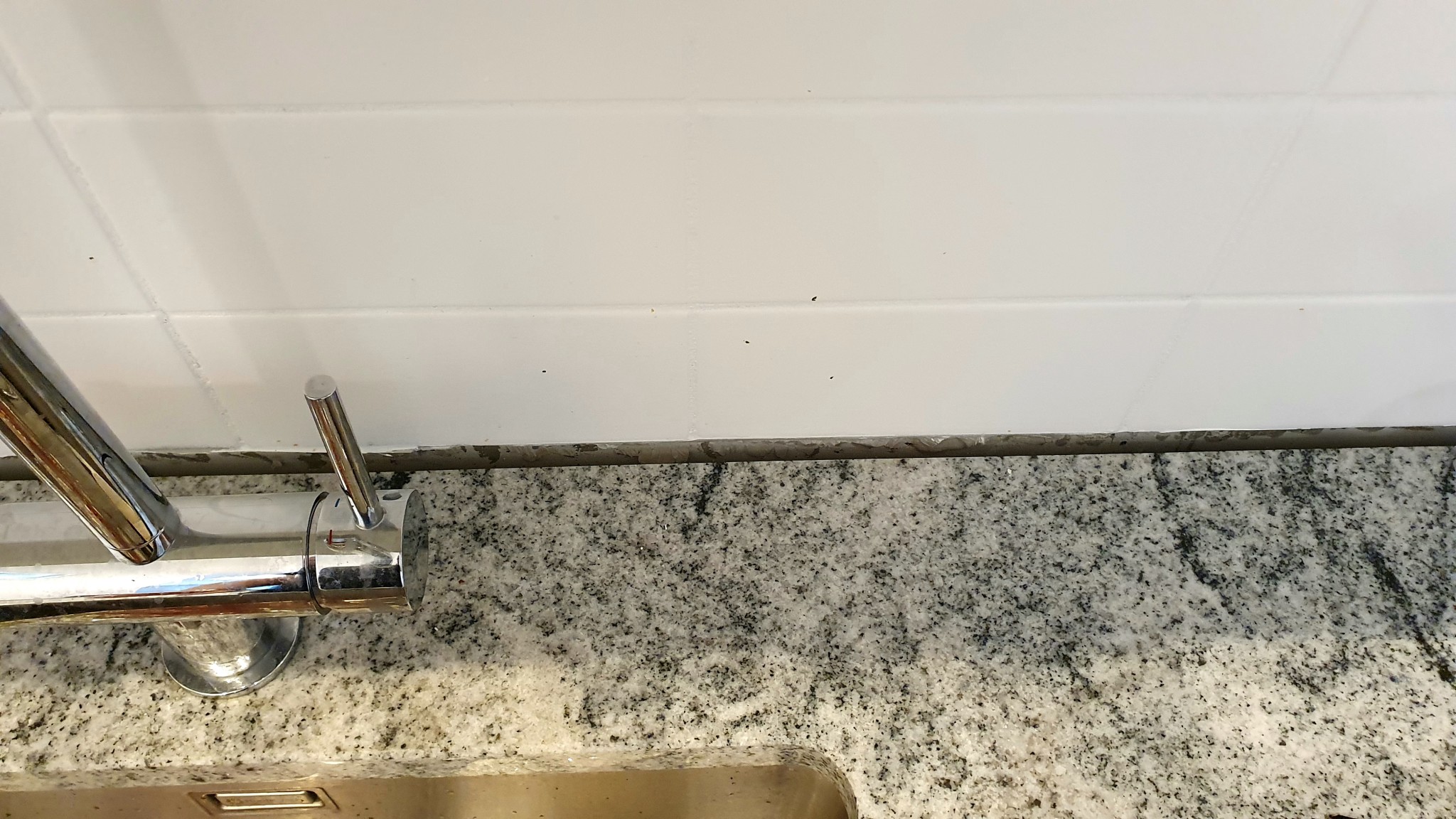 De som monterade bänkskivan hade som tips att vira ihop tejp för att täppa till glipan mellan skiva och vägg och sedan foga.