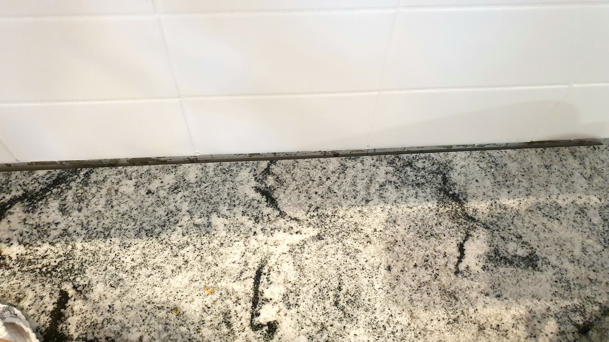 Har satt in en skiva i granit men då väggen är snett har det blivit väldigt stort utrymme mellan vägg och bänkskiva på sina ställen. Som mest är det ca 15mm och som minst någon enstaka mm.