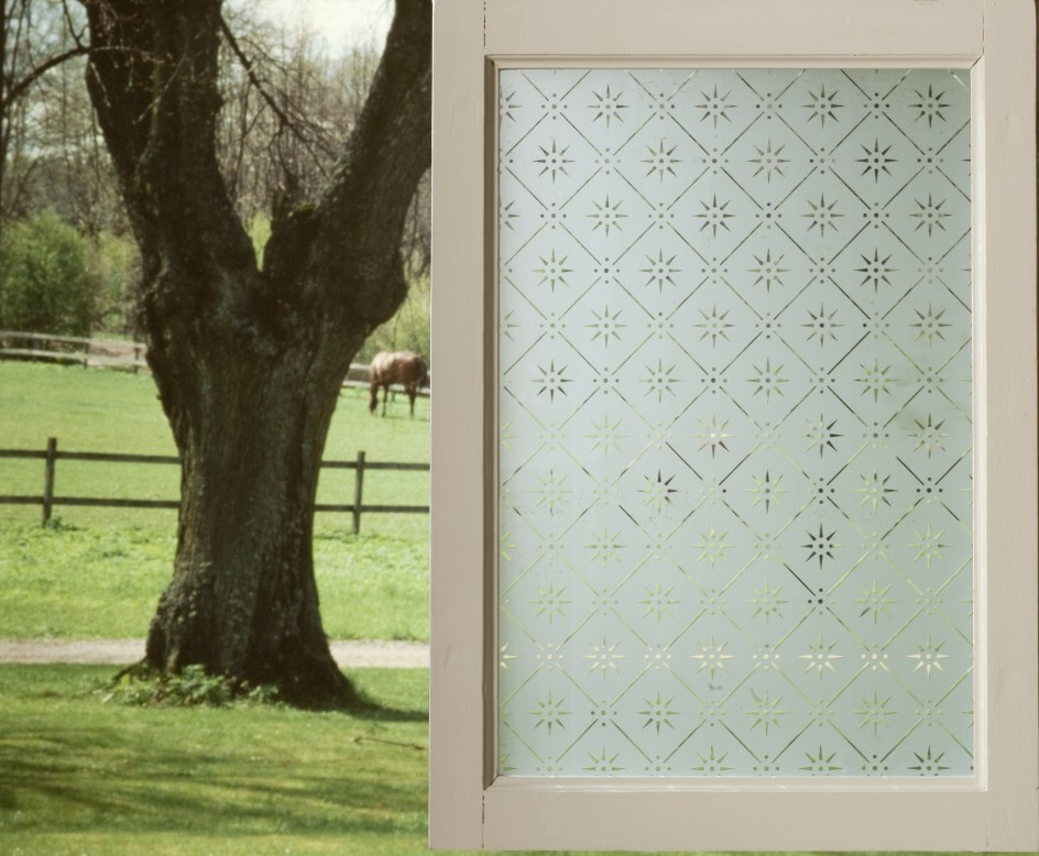 Det är ju bara att rita i lämpligt vektorgrafikprogram och skicka till folieskärare? På så sätt kan du hu även anpassa mönstret till glasytan.