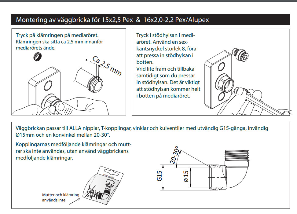 Ska du verkligen ha en klämringA Axel bolander skrev:Väggbrickan är gjord för Alupex 16x2.2 men det är helt omöjligt att få dit klämringen när klämringen när väggbrickan är på plats - har även provat pressa in den med smala plastverktyg. Funderar på att bara sätta en koppling ([bild]) men det löser inte problemet jag får med duschblandarfästet.. förslag på annat brand väggfästen som funkar med fasta Alupex..