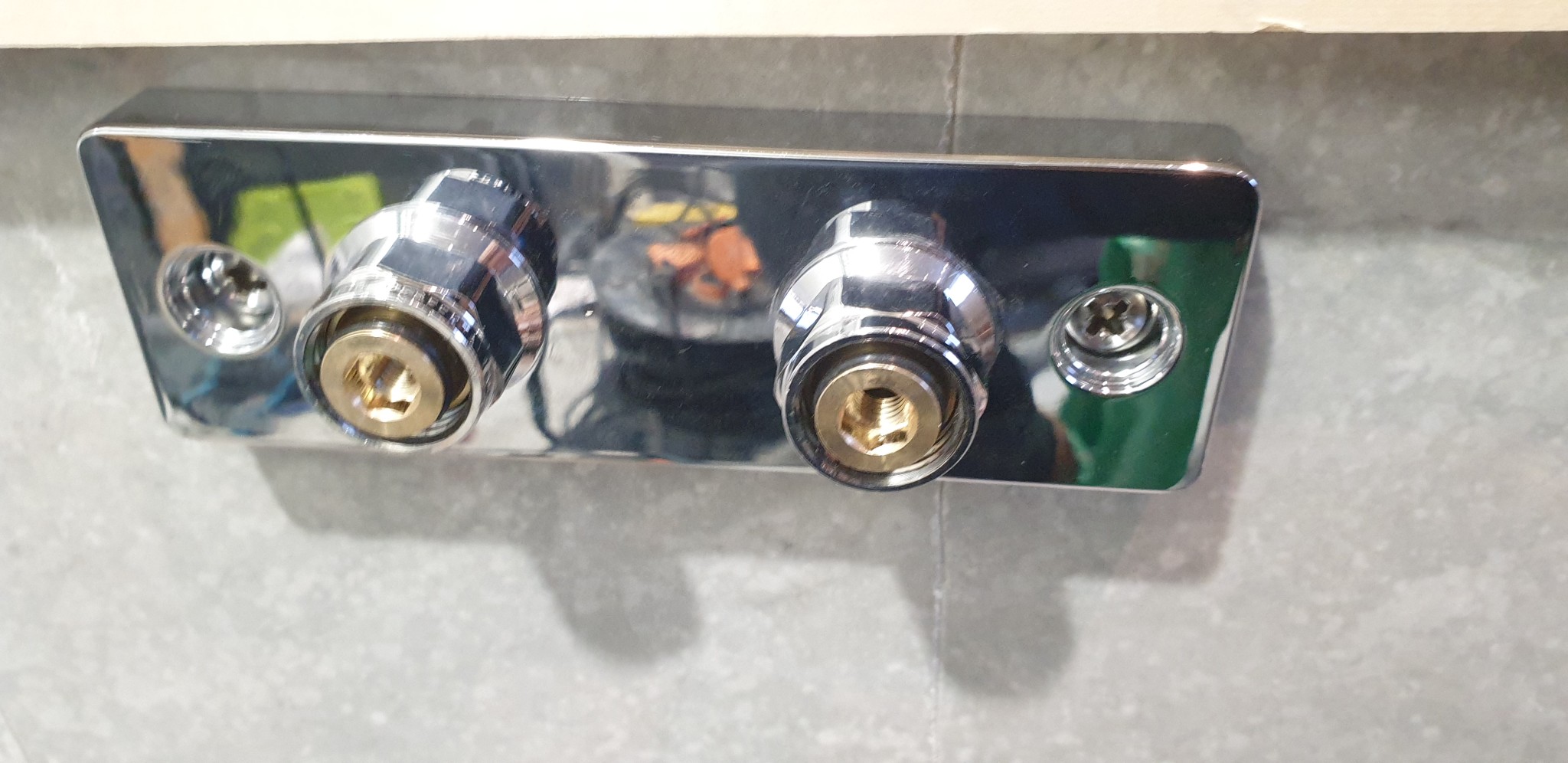 I efterhand borde jag ha bytt ut antingen hela väggbrickan till Vatette - eller tagit en Vatette anslutningskoppling 16 2.0-2.5mm för pexrör (följer med Vatettes väggbrickor) - då hade jag sluppit pillet med klämringen