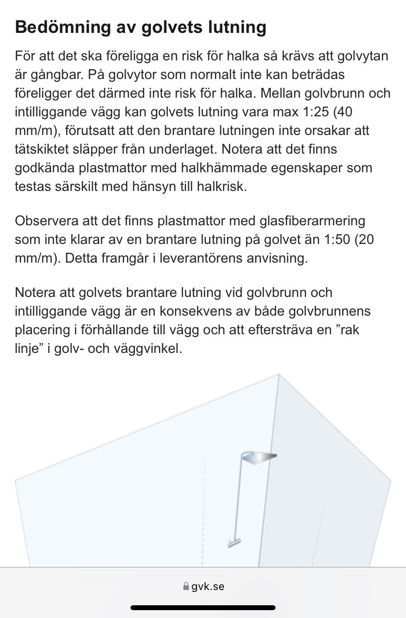 Jag jobbar inte med badrum och därför ställer frågan. Det står på GVK.se att vissa material inte klarar brantare lutning, se bild. Därav vill jag försäkra mig att jag inte står med problemet i framtiden.Raskus skrev: