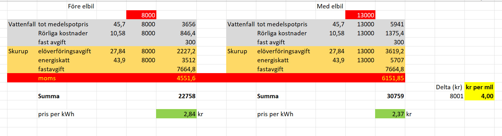 Ok, då är jag med. Kanske något högt räknat med 1,60. Jag räknar med 1 kr. Samma med förbrukningen, där räknar jag med 1,80 kWh per mil. Eller rättare sagt så tog jag utfallet 2024 och la på 5%trähandtag skrev: