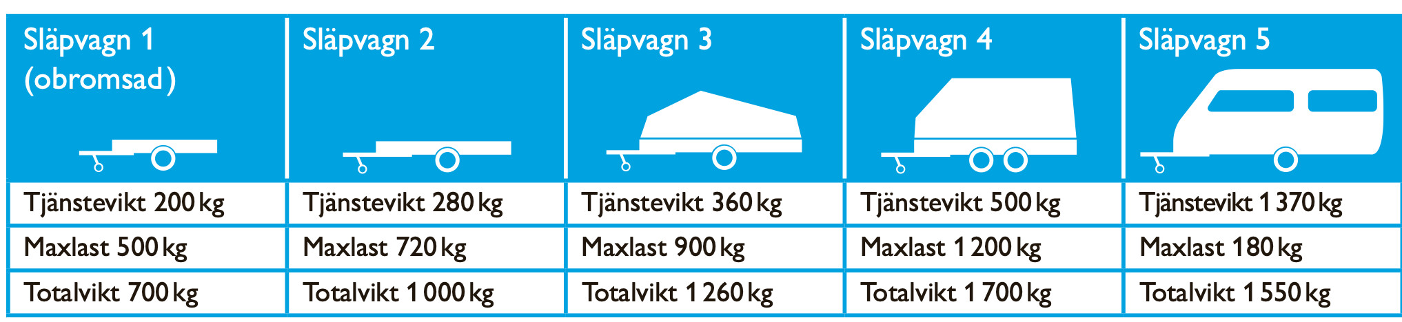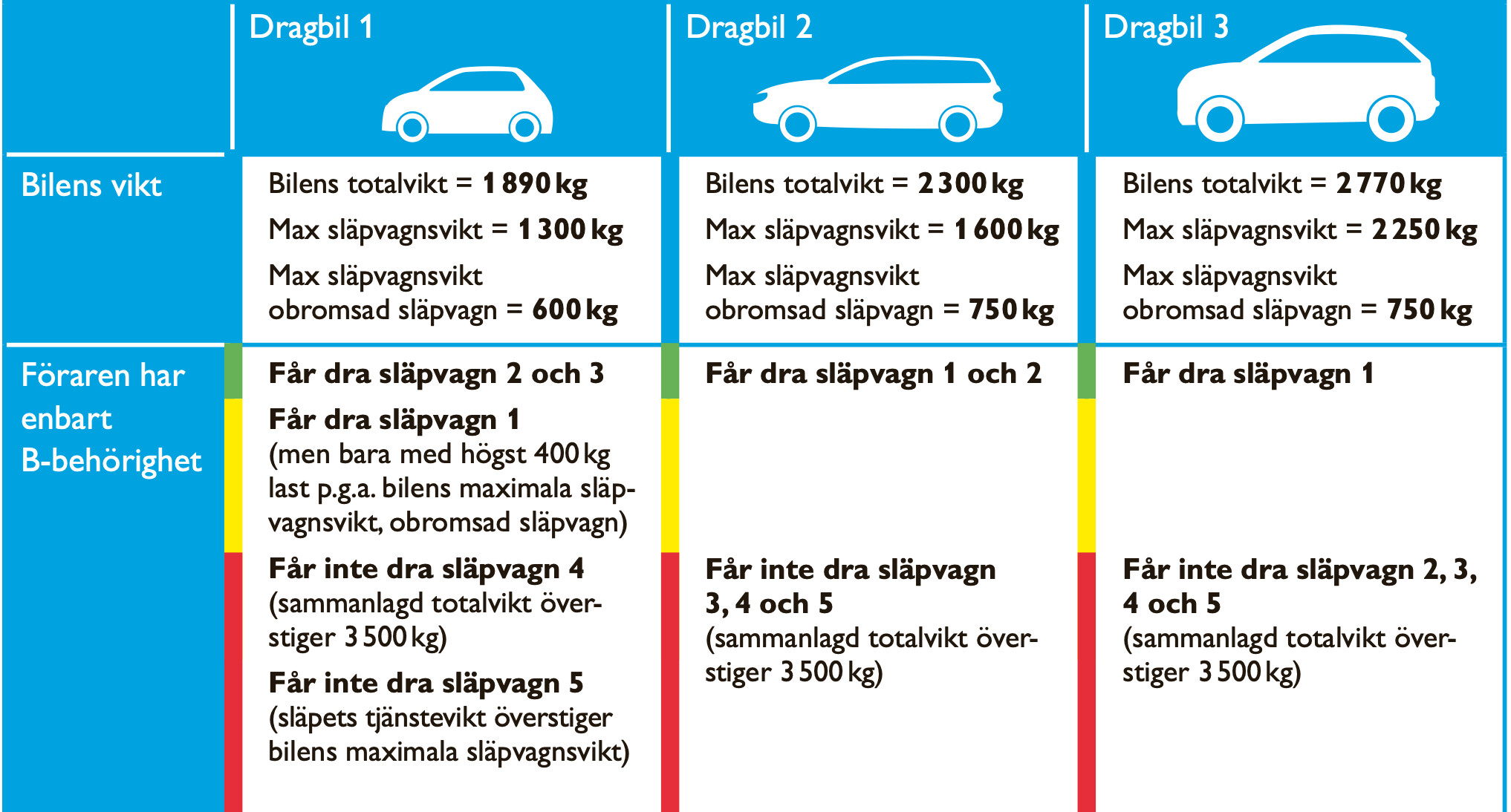 Har du en bil med t ex 2000 kg totalvikt, men med max släpvagnsvikt 750 kg får du dra ett släp med totalvikten 1500 kg med B-körkort. Men du får inte lasta släpvagnen så den väger mer än 750 kg.
