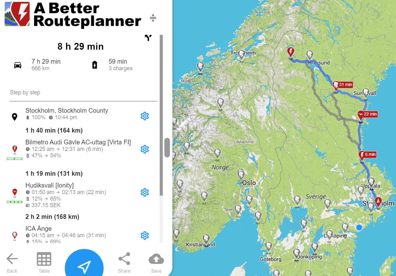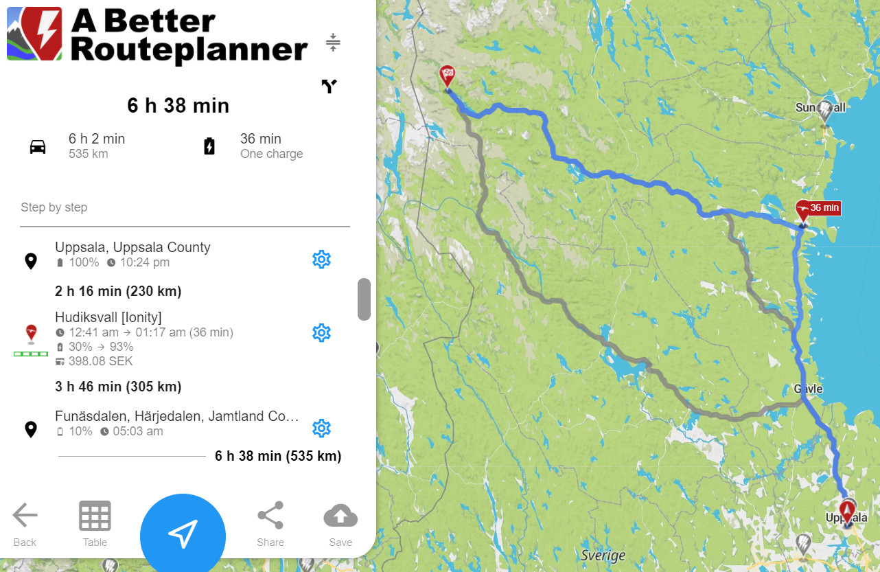 Men alltså ju mer jag tänker på det desto sjukare låter det, nästan så att man skulle vilja läsa testet. Jag simulerade resan med ID.3 i ABRP som brukar ge jäkligt bra prognoser. Beräknat med 15 minusgrader och 250 kg extra last utöver föraren och snöigt väglag så ska det räcka att stanna 36 minuter i Hudiksvall.Isakare skrev: