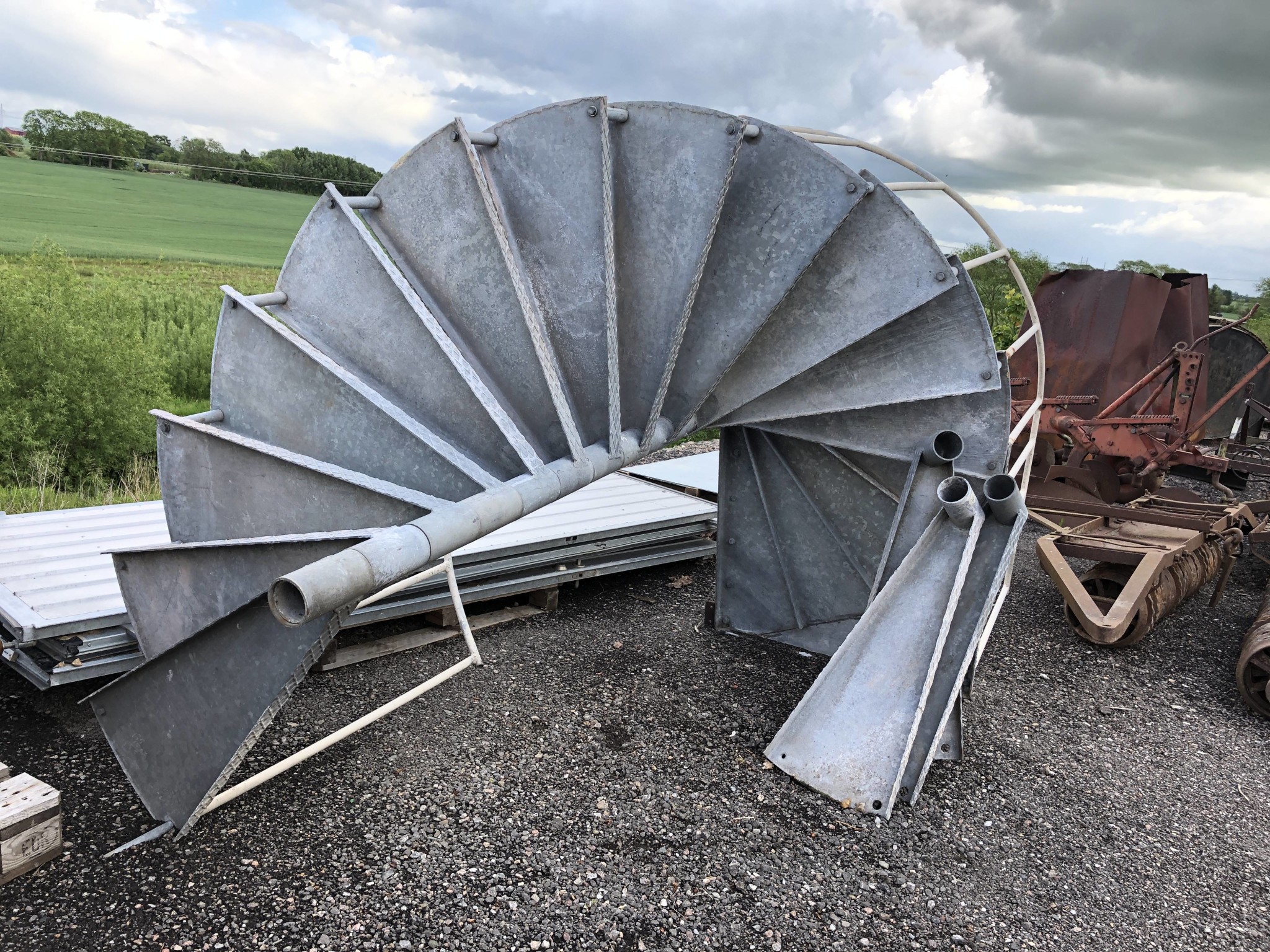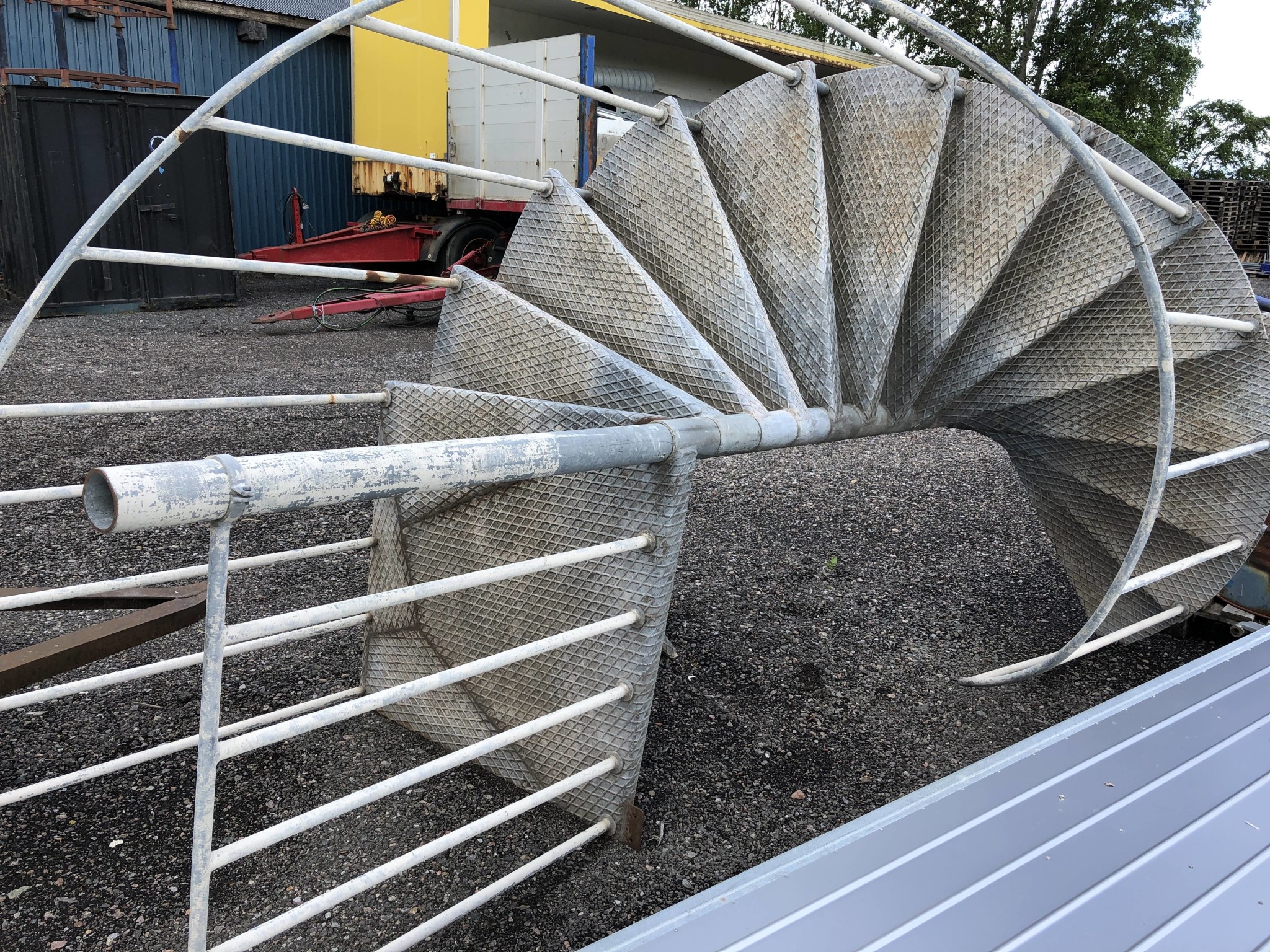 Spiraltrappan är inte något monster, 13 steg och höjd cirka 230 cm till planet högst upp. Trappan väger dock mycket eftersom den är i stål, gissningsvis ett antal hundra kilo. Jag förstår att spiraltrappor är ”självbärande” och att all vikt förs ner mot marken där spindeln (röret) står. Trappan är begagnad och fäste för foten, eller fot, saknas - den slutar bara med ett rör mot marken.