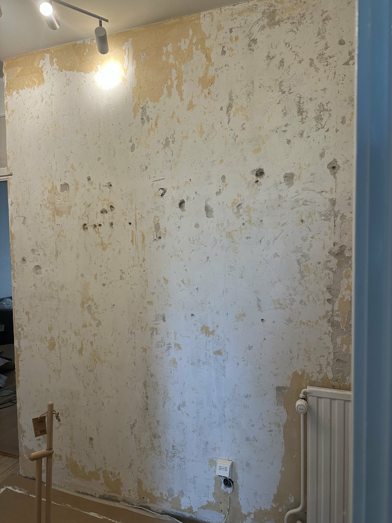 Förarbete inför bredspackling av putsvägg där det tidigare satt en tapet