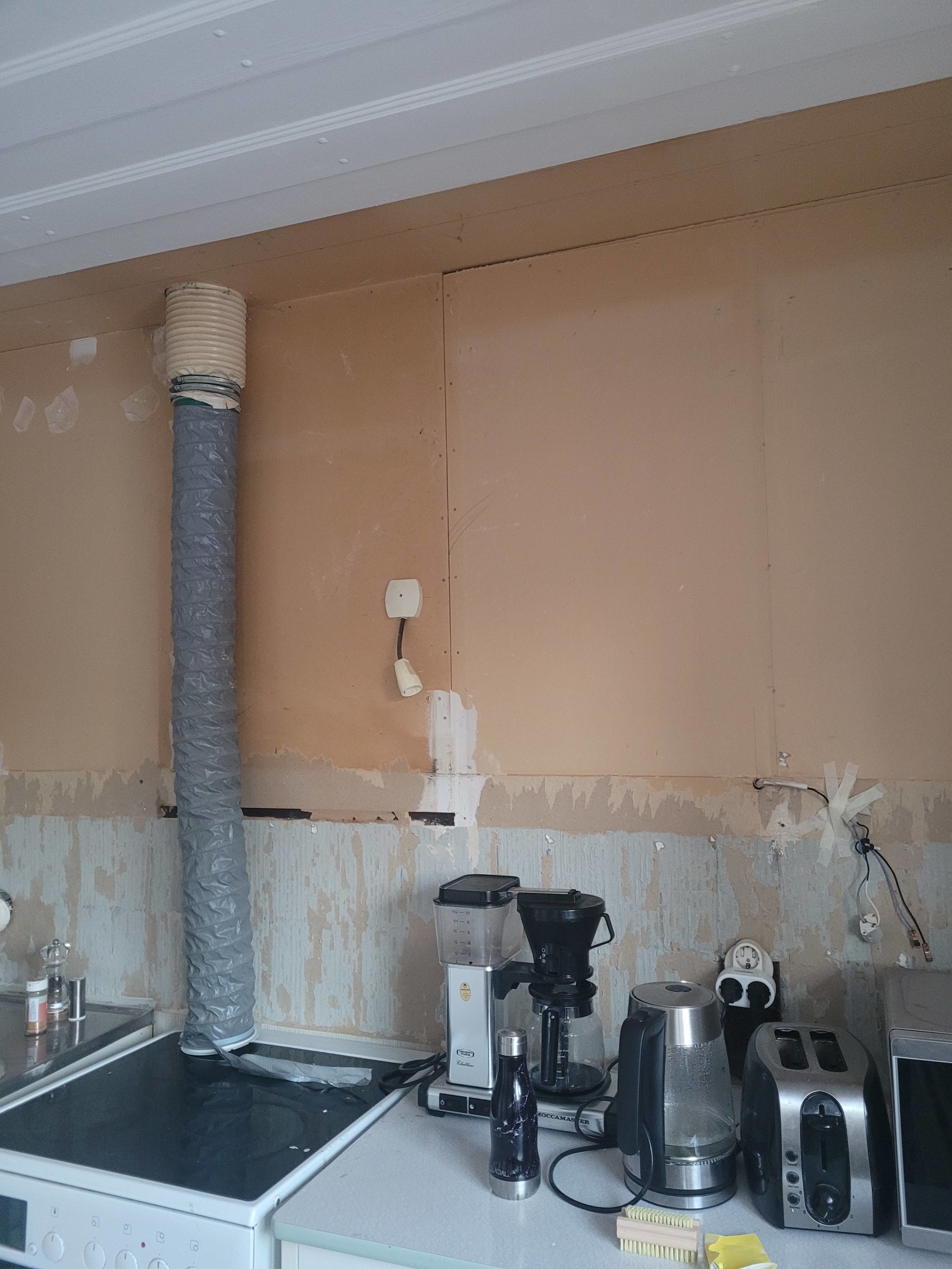 Har tagit bort dom gamla överskåpen och ska på en del av väggen sätta upp nya, men inte över hela väggen. Väggen ska målas. Väggen är gipsskiva som inte ser så rolig ut med en del större hål. Underst på väggen ska det vara kaklat. Jag har skrapat bort så mycket gammal fog jag kunnat och planerar att sätta renoveringsgips över. Men ska jag sätta renoveringsgips över hela väggen eller ska jag spackla igen alla hål? Se bild (ignorera fläktslangen, den ska bort)