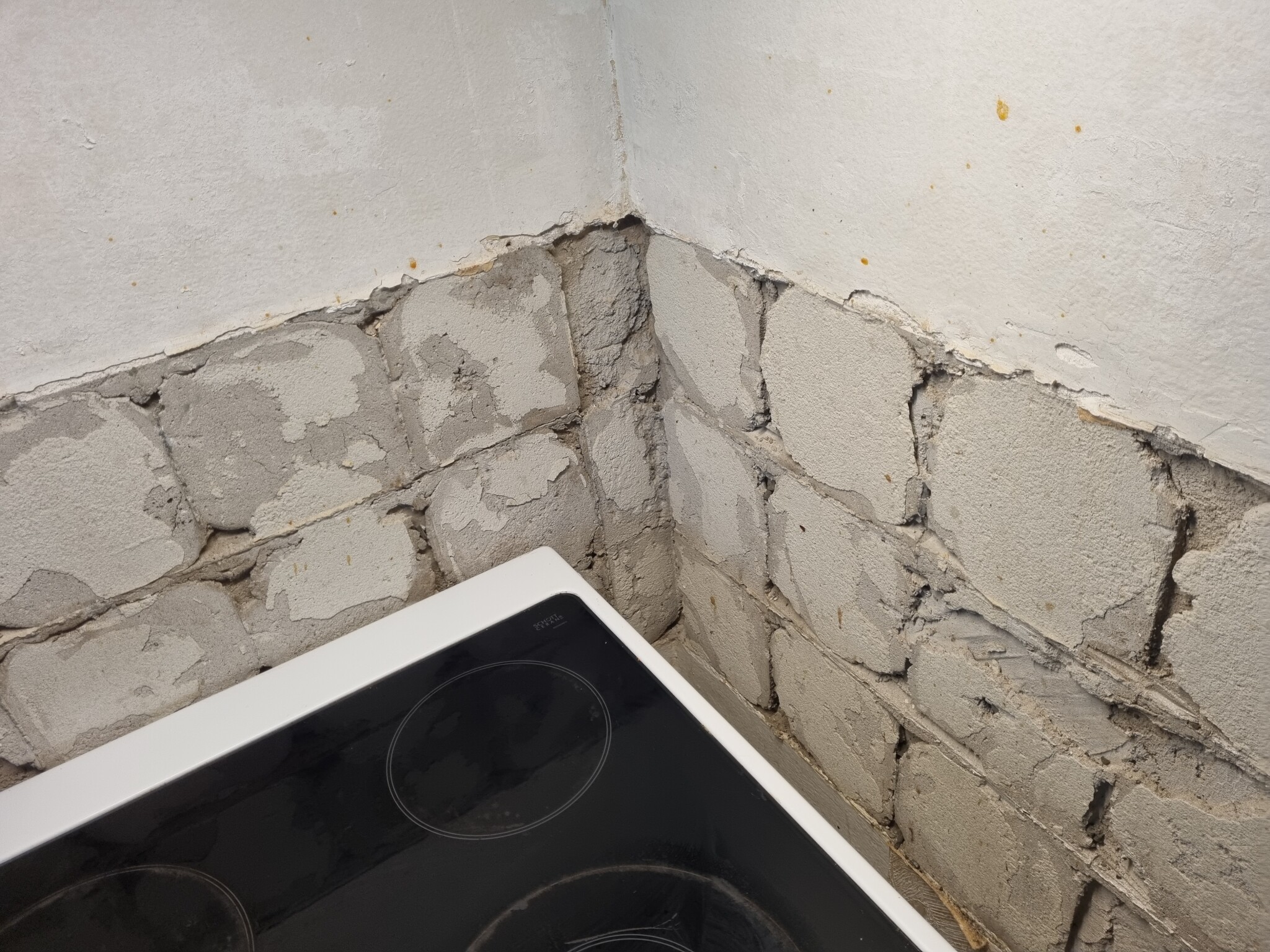 När jag knackade det gamla kaklet lossnade en del av materialet bakom och det blev fula hål på några ställen.