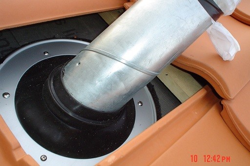 4a. Det finns färdiga tätningar för rören genom taket. På bilden ser du den typ jag använt och som är levererad av Monier. Röret går således vertkalt genom taket och gummikragen tar hand om vinkelfelet som då blir. Gummikragen limmades mot takduken sen förstärker plåtringen det hela.