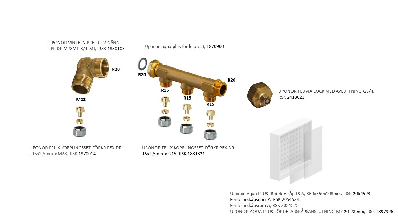 Förutsättningarna är att husleverantören förberett två matningar/ returer (Uponor CombiPex 15x2,5) till övervåningen, vilka kommer upp i vardera hushalva (tänk delning längs taknocken). För att sen fördela dessa vidare till radiatorerna tänker jag mig ett tvårörssystem (även här combipex 15/2,5). Resten av huset samt de förberedda matningarna / returerna är Uponors prylar och det känns därför rimligt att fortsätta med deras komponenter.