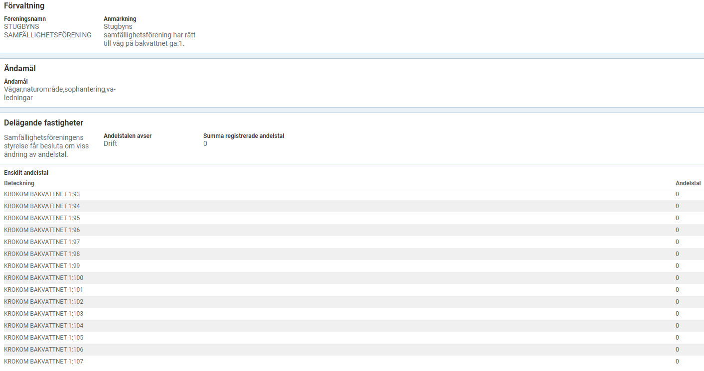 Det är nog inte ovanligt att det ser ut så här vid småhusbebyggelse av villakaraktär. Antingen en andel var eller en andel per bebyggd fastighet. I mitt närområde har man kört på det förra och här uppenbart på det senare. Just nu verkar det ju inte finnas några andelar alls för drift.P phälle skrev: