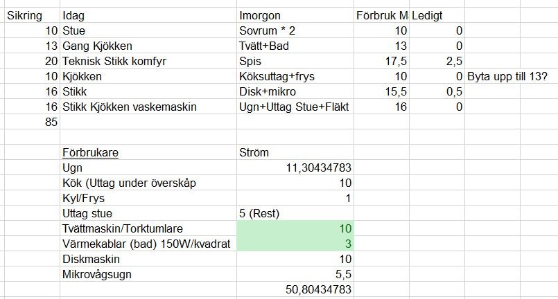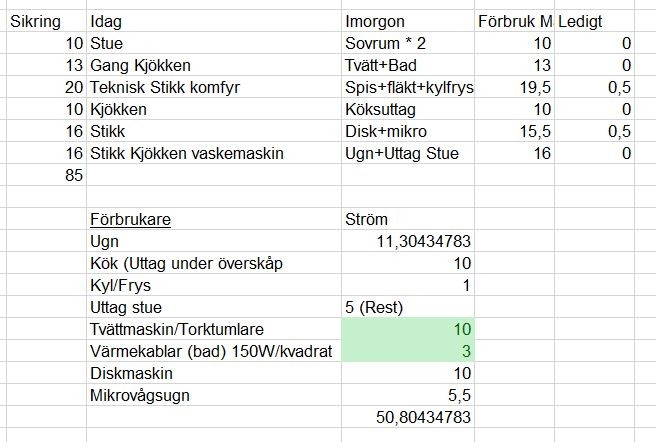 Idag har jag tänkt det som ovan. Komfyren/Spisen är strömbegränsag till 17,5A. Resterande är tagna direkt ur databladen. Tvätt/Torktumlare kommer jag vilja ha en switch för att slå mellan.