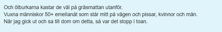 Jag har utläst att det är äldre som inte beter sig med. Om det är barn som kastar ölburkar och pissar mitt på vägen så har vi ett fall för soc och inte kommunen. Då är problemet löst redan nästa vecka.M maria01 skrev: