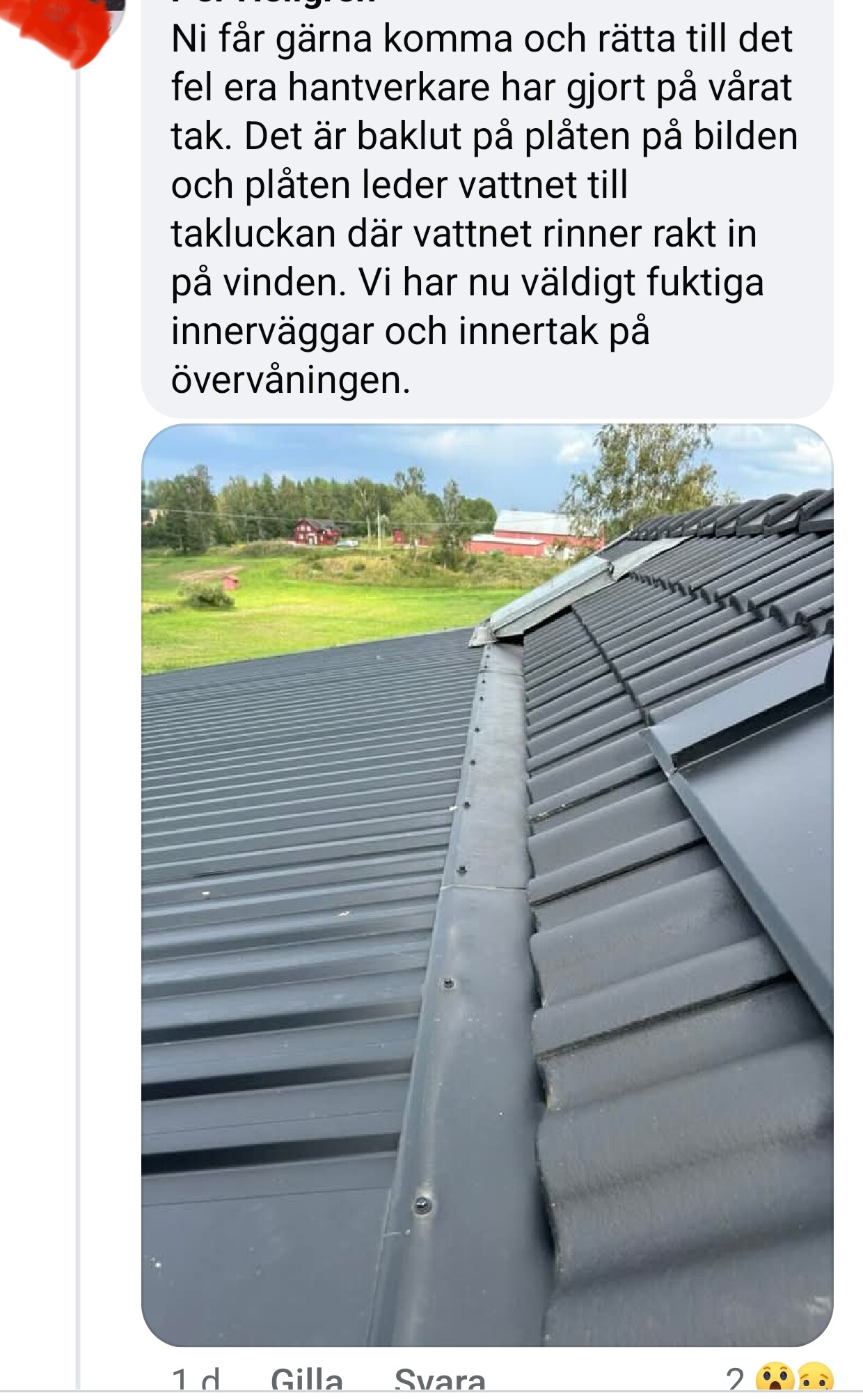 Karma finns på riktigt. Ett takföretag annonserade på Facebook. Kollade kommentarerna och hittade det här guldkornet. Gissa vem som är den missnöjda kunden? Jo projektledaren för min badrumsrenovering som behandlade mig som skit. Och tyckte att det var mitt fel när hantverkarna gjorde bort sig 😂[bild]