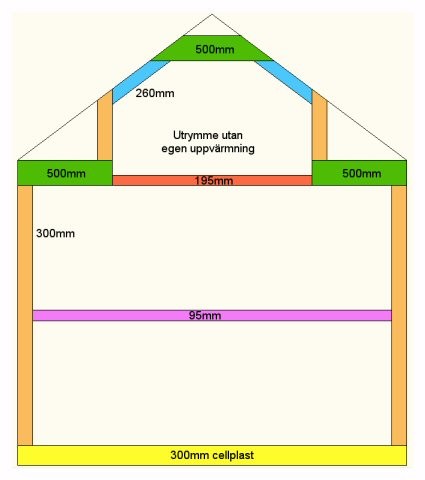 Vårt hus är (än så länge) bara isolerat i ytterväggarna, mellanbjälklagen och plattan enl. bilden, men vi har tänkt använda 260mm i snedtak och 500mm i tak. Är det för lite med 260 resp. 500 gentemot vad vi har i väggarna?