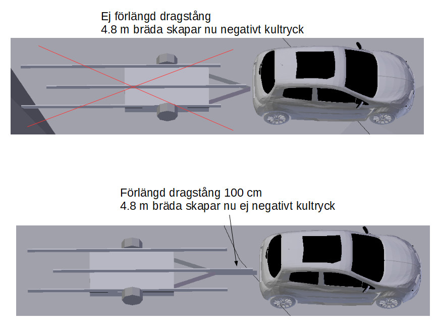 För att tillfälligt kunna kunna lasta längre brädor (4.8 m) på ett kort släp utan negativt kultryck, så funderar jag på att förlänga dragstången m.h.a. en balk (100 cm). Är det ok att göra så? Eller får man då max köra 30 km/h (som efterfordon), eller vad gäller?