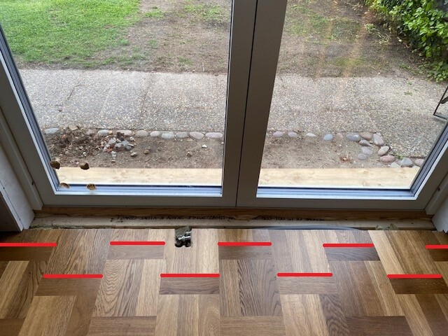 Vi har precis installerat en pardörr i vår köksvägg vilket har lämnat ett gap mellan vårt befintliga golv och den nya dörren (bild1). Jag skulle vilja förlänga parkettgolvet så att det sträcker sig till dörren. Jag har ett par golvplankor över sedan jag la golvet tidigare.