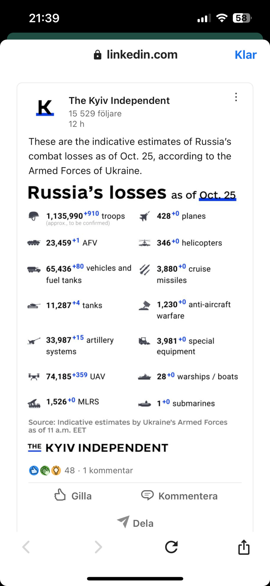 Märkligt, siffrorna över de ryska förlusterna kommer från ”Ukraines Armed Forces”.H HenrikHuslöse skrev: