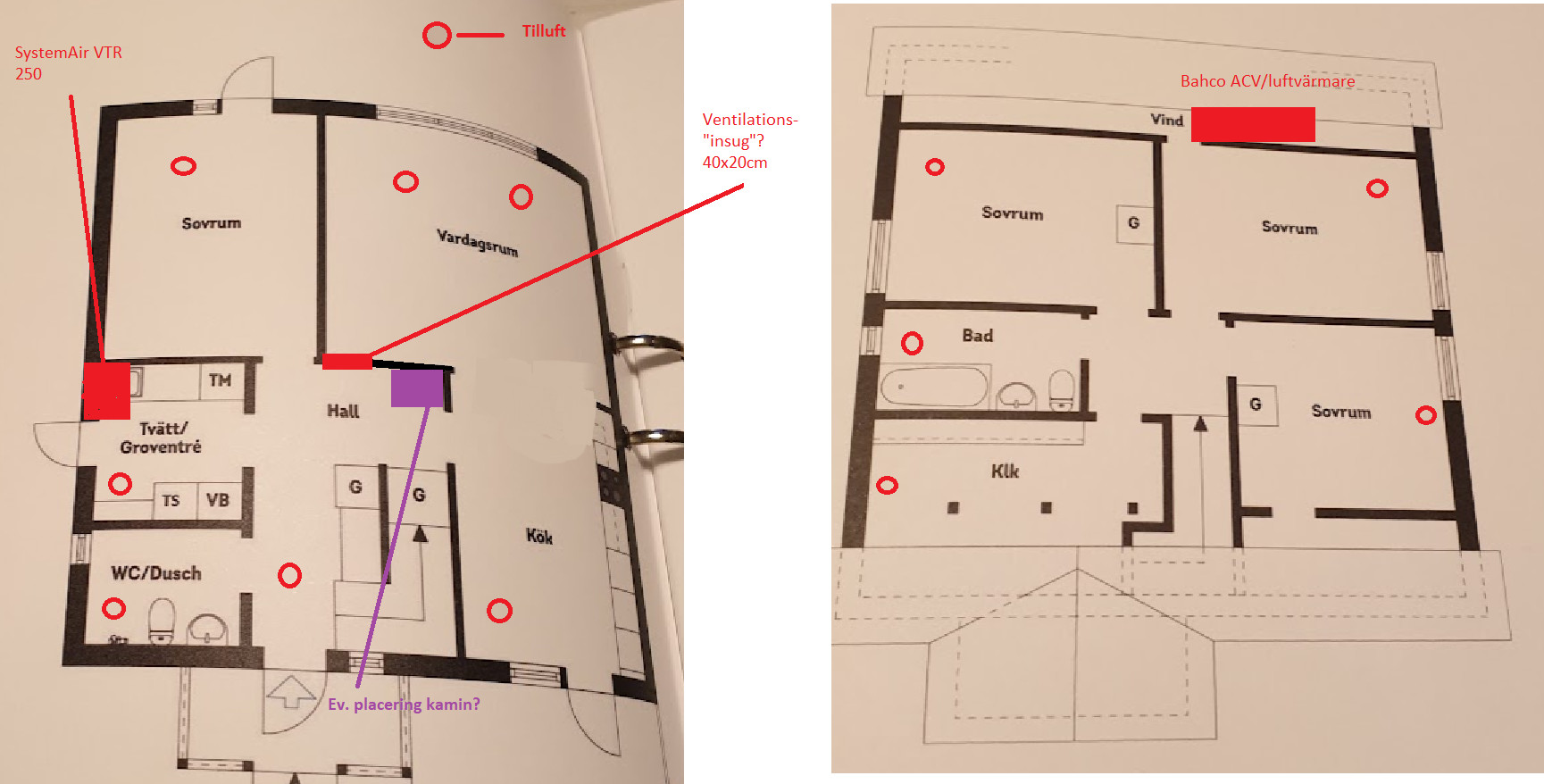 Måste en ev. kamin stå i hallen? Där har vi något som jag på ritningen benämnt som ventilations-insug. Det är en 40x20cm trumma där det suger in luft, jag är osäker på syftet med denna...