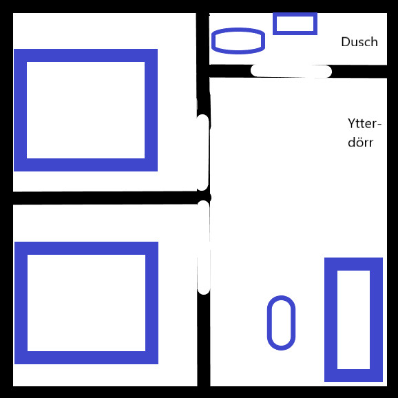 Två sovhytter till vänster med sängarna utritade i blått.