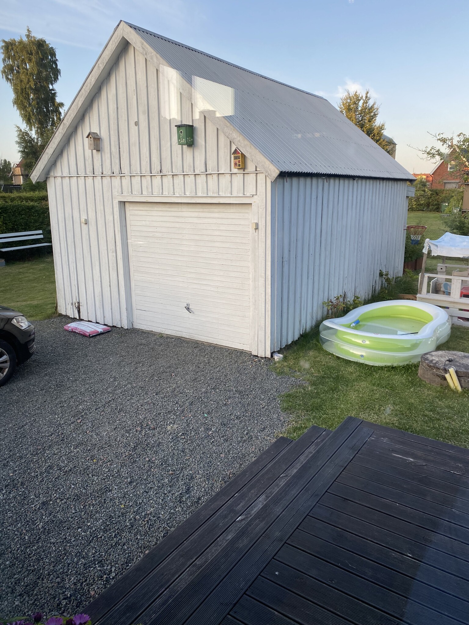 Vi är i första stadiet i att planera för ett uterum där ni ser att uteplatsen är just nu. Vi är inne på ett Willabgarden-uterum. Jag ringde idag till kommunen för att höra mig för kring regler och bygglov etc. Blev då medveten om (hade ingen aning om att detta skulle ställa till problem) att vårt garages placering gör det mycket krångligare när det gäller att tillgodose brandskyddsreglerna. Blev lite som en kalldusch och vi funderar nu på hur vi ska göra. Garaget är gammalt och i dåligt skick men står fortfarande stadigt och används bara som förråd. Har en plan att längre fram riva det men nu går tankarna om det skulle ske nu istället. Att klä om det med gips känns inte prisvärt med tanke på skicket. Vi funderar även på att istället klä in ena kortsidan på det framtida uterummet och göra det brandskyddat som kommer vara längst med trappan som man ser på bilden. Vet dock inte om det blir estetiskt bra eller om det spelar någon roll då vi ändå skulle haft vanliga glaspartier framåt. Just nu vet vi inte vad och hur vi ska göra saker. Har ni några förslag eller idéer?