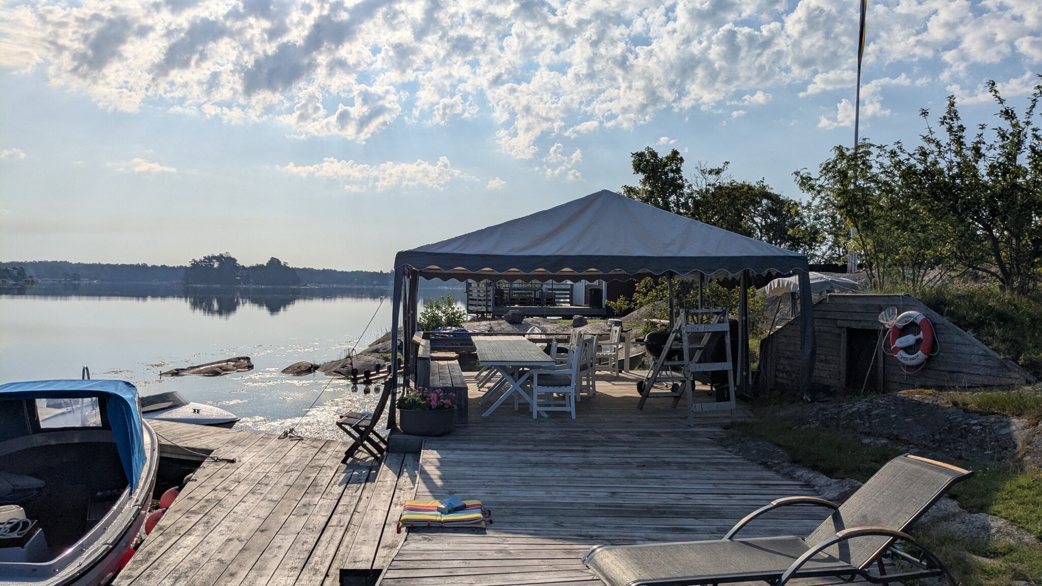 Idag har vi ett tillfälligt tält för att få skugga och skydd från diverse regnskurar som hör svenska sommaren till.