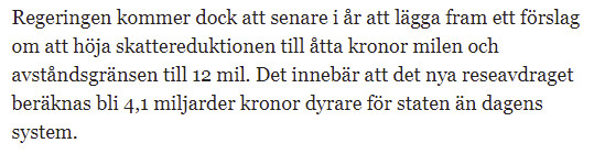 Jag tycker nog att det är bättre att skrota systemet helt faktiskt och ge tillbaka pengarna till alla skattebetalare som kollektiv genom en sänkt skatt.P Pin skrev:Hade jag bott på landsbygden hade jag gynnats då gränsen där är 15 km, medan det i storstad är 30 km och jag har däremellan. Så jag får ingenting medan ”jag” på landsbygden hade fått göra avdrag.