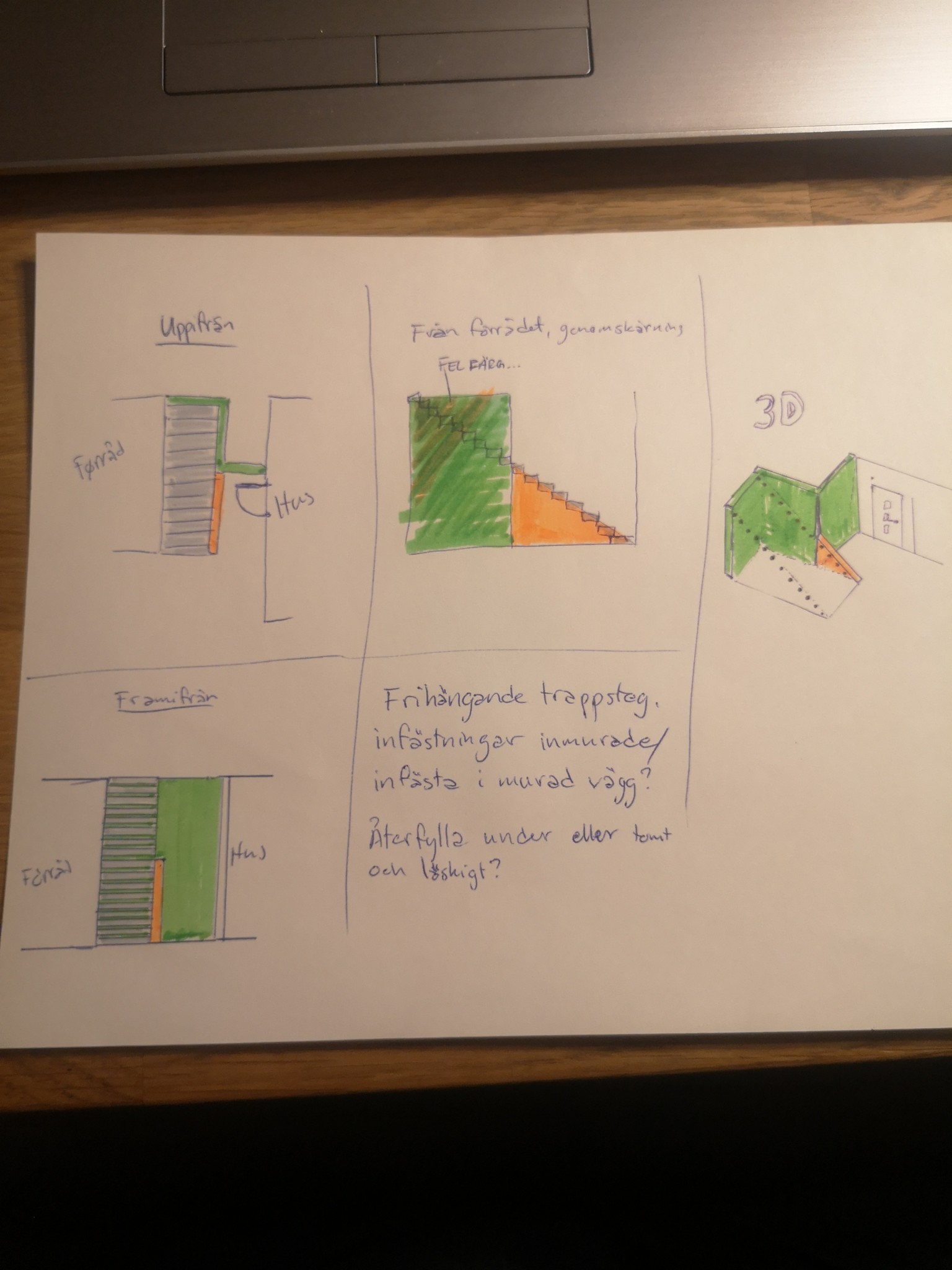 Hej, bygger ett nytt sutteränghus som snart står klart, med fristående förråd och 3m höjdskillnad mellan över/nedre tomtytan. Kommer ha en trapp på var sida huset, på ena sidan är bara jord så där blir nån klassisk trädgårdstrappa, men på andra sidan är det stödmurat (leca) mellan hus/förråd och grovingång, och vi har inte helt bestämt hur/vad för trappa det ska dit. Har nån nåt förslag på en lösning? Det är norrsida så där kommer alltid vara skuggat, så tänker att trä går bort, det lär bara bli mossigt och halt.