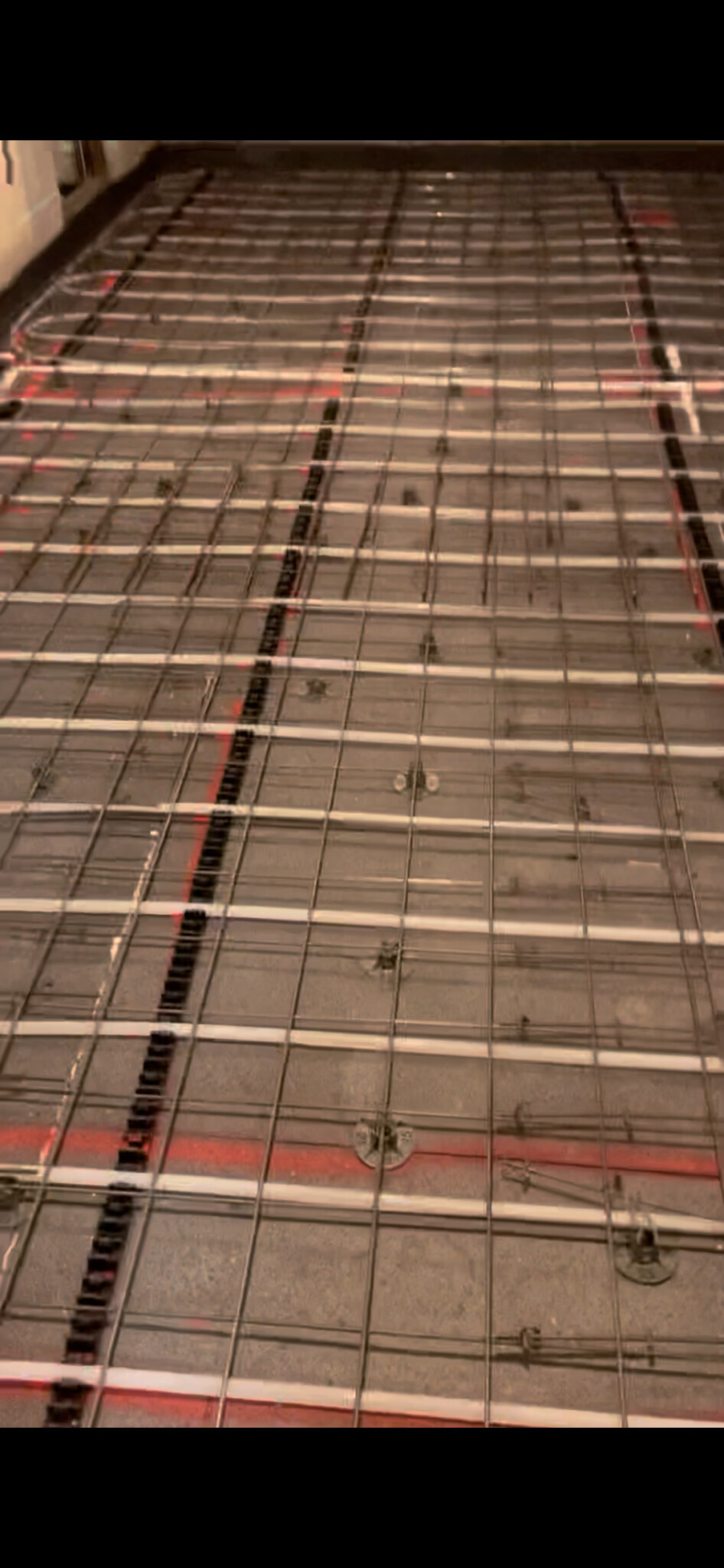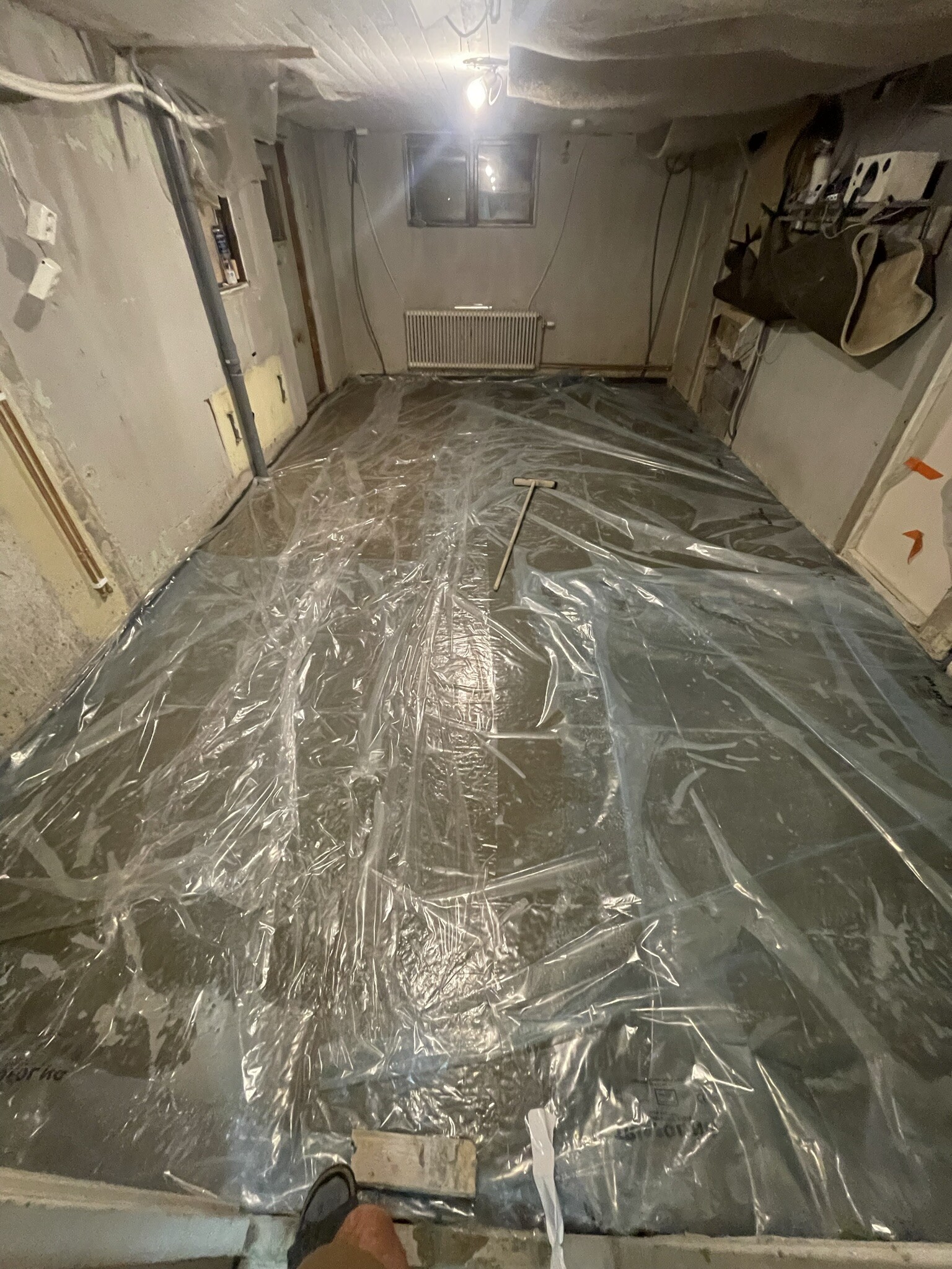 På detta kom så klart armeringen. Körde 6150 nät som jag var tvungen att klippa upp för att få in det i bilen. Tyvärr inga bra bilder. Satte också plast mot befintliga väggar + två sidor fick 7mm sylisolering. Framförallt för att flexa lite när plattan expanderar av golvvärmen men också bryta lite köldbryga.