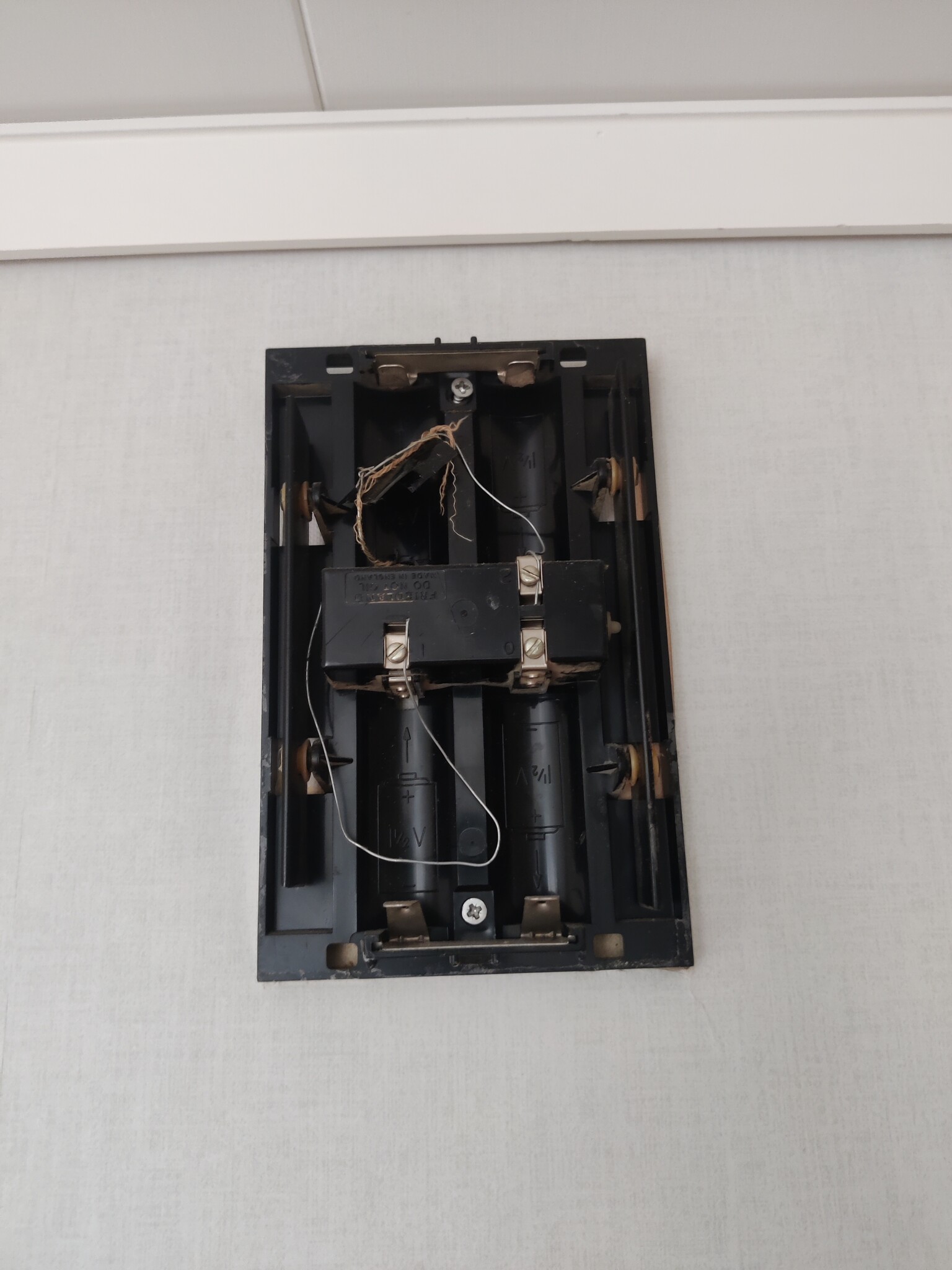 Jag trodde att den var batteridriven men det visade sig att gamla ägare har gjort nåt med den och dragit fram sladdar till den. Ni ser att den ska egentligen drivas av 4st batterier men gamla ägaren dragit fram kablar. Från knappen på utsidan går en sladd in i väggen.