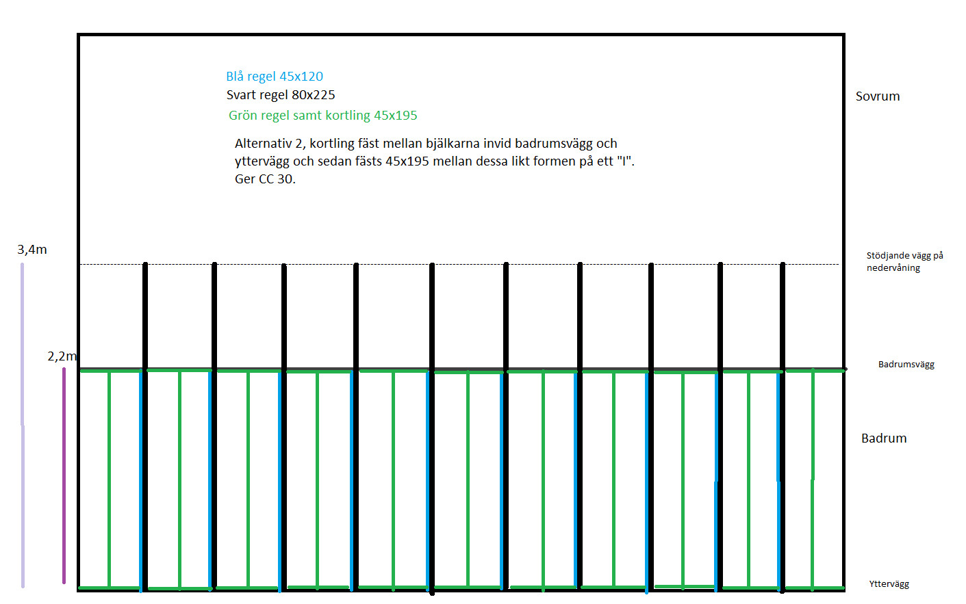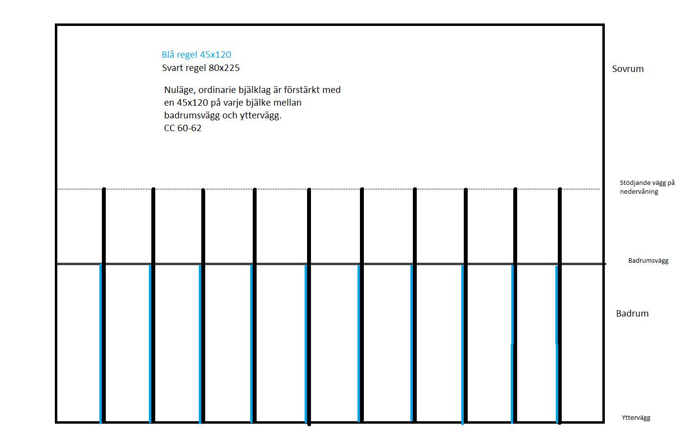 Spännvidden på bjälklaget är ca 3,4 m men bara ca 2,2m av dom är inne i badrummet. Dvs jag kommer inte åt att förstärka bjälklaget på hela spannet utan lite över en meter fortsätter in i sovrummet bredvid.