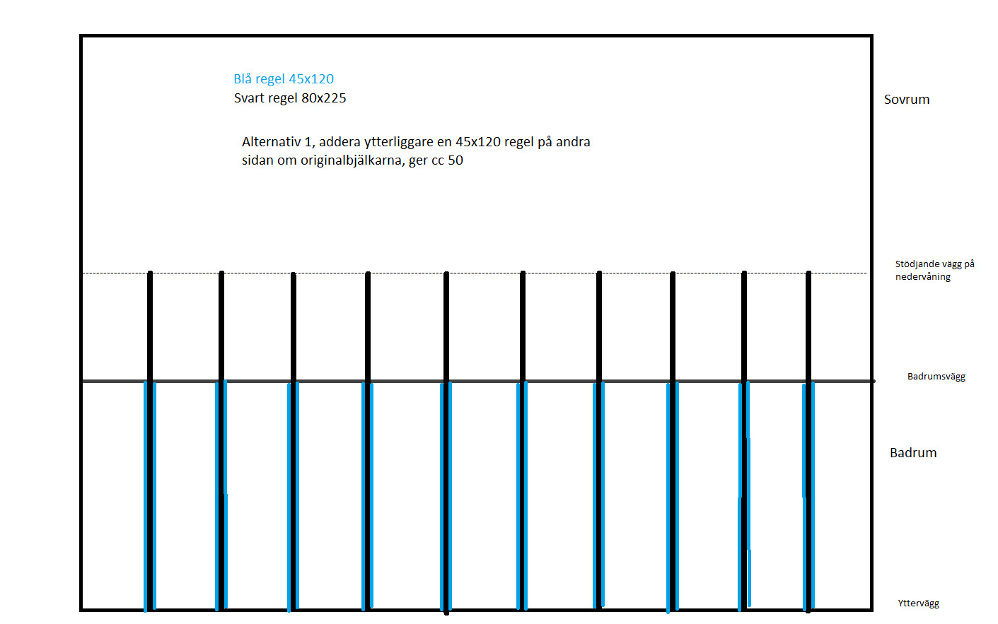 Vad är lämpligt att göra för att förstärka bjälklaget, duger det att sätta en till 45x120 på andra sidan originalbjälkarna och på så vis få cc 50 ungefär? eller bör jag kortla invid vägg och sätta en 45x195 på 2,2m mellan bjälkarna för att få ett cc på ungefär 30? eller duger ingen av dessa lösningar för att jag inte förstärker hela spannet?