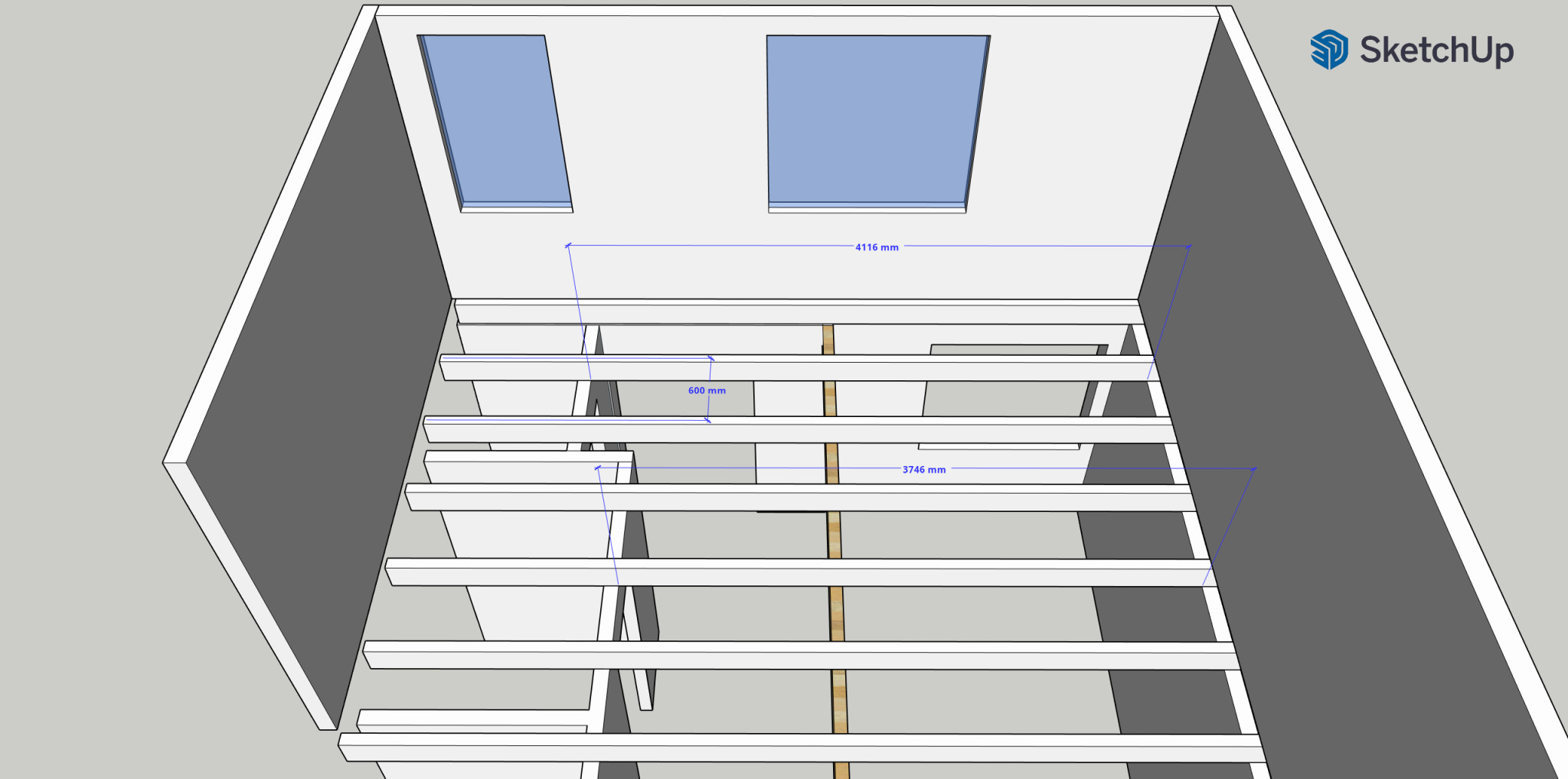 Jag hade även en idé om att räta upp golvet i och med att det är en liten svacka. Kanske fungerar att öka dimensionen på reglarna (läkten) och skruvlimma reglerna i sidan på befintliga bjälkar för att få ett jämnt golv...
