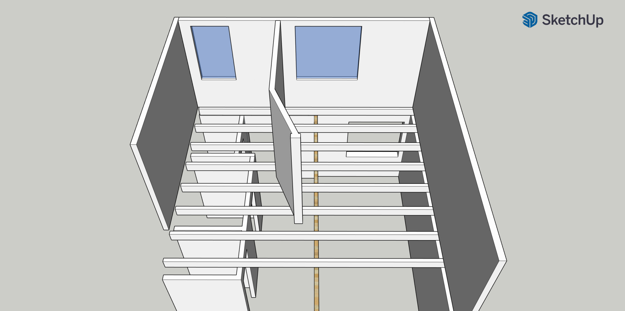 På våningen under finns en vägg och en limträbalk tvärs bjälklaget.