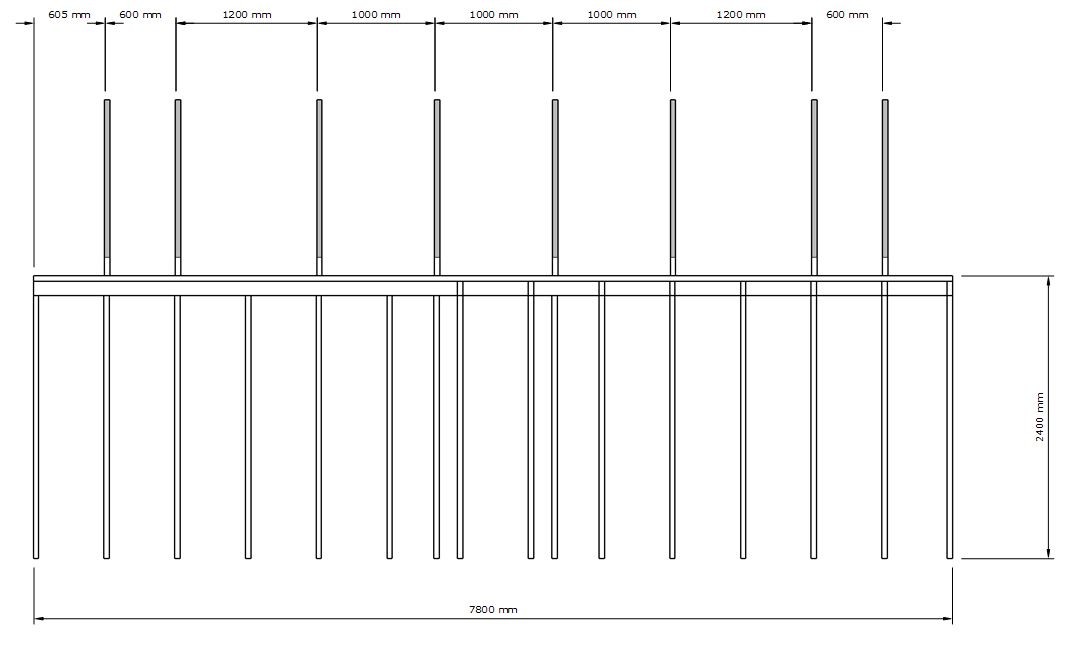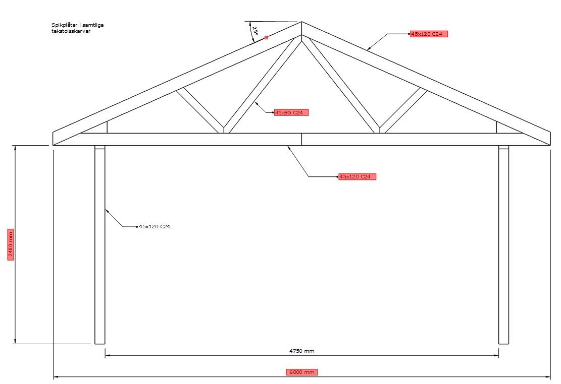 Befintliga takstolar har 6m spännvidd och under- och överram är byggd med konstruktionsvirke C24 45x120 med spikplåtar i samtliga skarvar (inkl underramens mittskarv) enl skiss. På taket ligger råspont och betongpannor. Som längst är det 1,2m mellan takstolarna (de yttre). De inre ligger tätare med 1,0m.