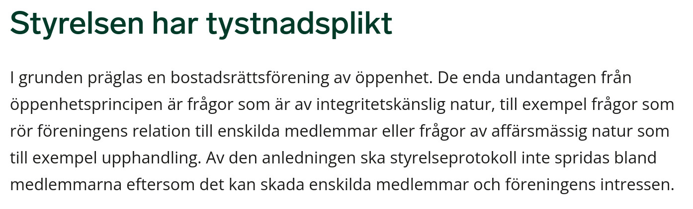 Visst har du rätt i det. Min grundinställning är dock att en BRF styrelse ska hålla tyst om det inte finns väldigt starka skäl att inte göra det.globaljuggler skrev: