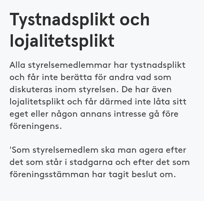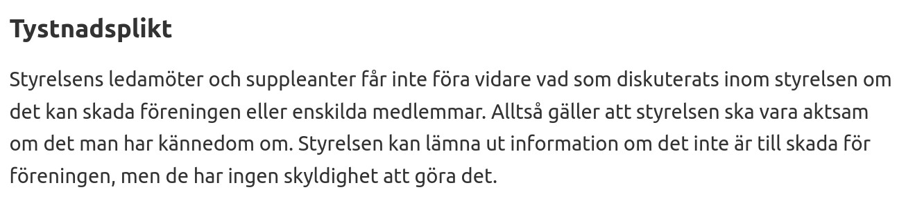 Notera att tystnandsplikten i ovanstående exempel verkar gälla då det "kan skada föreningen eller enskilda medlemmar". Jag skulle vilja påstå att det motsatta gäller här, det är för att skydda medlem.Alfredo skrev: