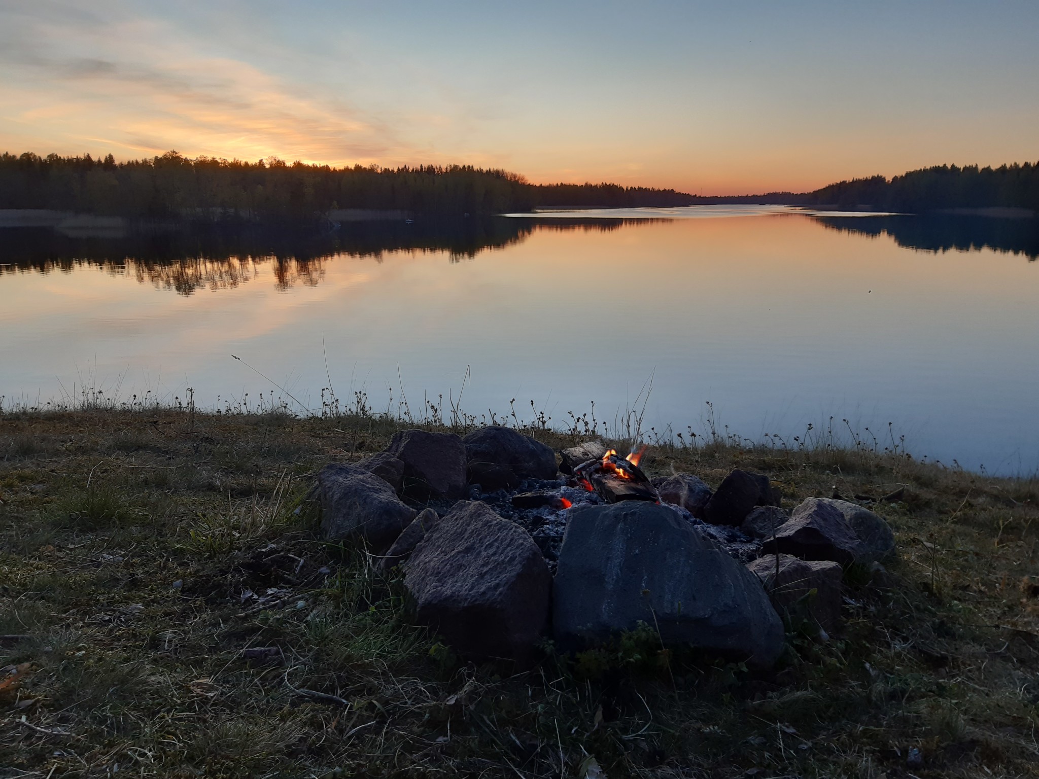 Solen går ner över norra Roslagen i fredags. Sjön nedanför heter Närdingen och sitter ihop i ett större sjö- och åsystem som avvattnar skogsbyggderna norr om Norrtälje. Fina paddelvatten. Brasan falnar och snart återstår bara att krypa ner i sovsäcken.