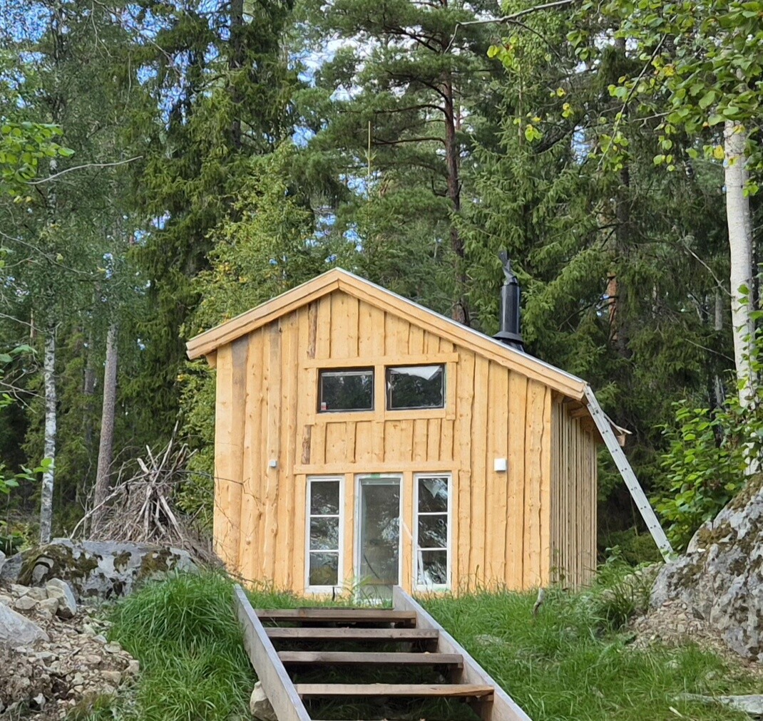 Så här ser det ut nu. De där plåtbitarna är egentligen den sista stora utgiften. Totalbudget hittills på stugan cirka 12k, vinterisolerat. Taket är plåt jag hade liggande - därav formen. Tjock isolering från rivningar. Sågat upp allt virke själv. Beggade fönster och dörr. Elen är kombo jag köpt å fått av grannar. Skorsten fick jag mot att jag monterade ner och tätade taket där den satt innan. Mest all vindpapp, underlagspapp, spik och skruv som stått för kostnader egentligen. Tänker att de här plåtdetaljerna inte ska få dra upp kostnaderna - inte om jag ska fortsätta bygga i det tempo jag gjort senaste åren iallafall. Detta är ett av flera projekt, påbörjat i slutet av maj typ varannan helg.